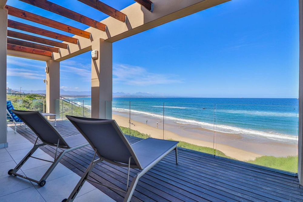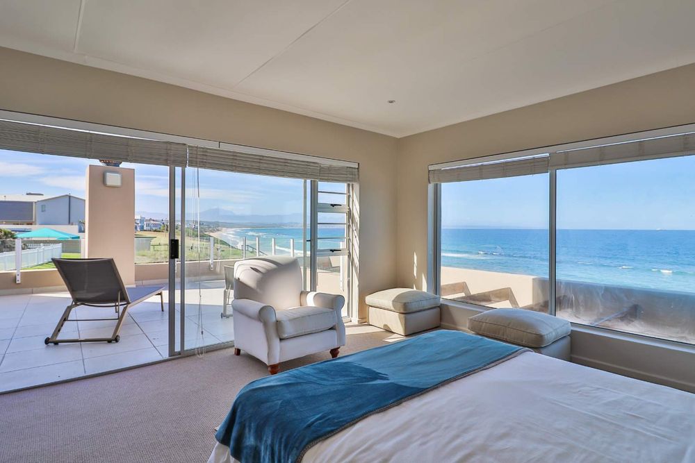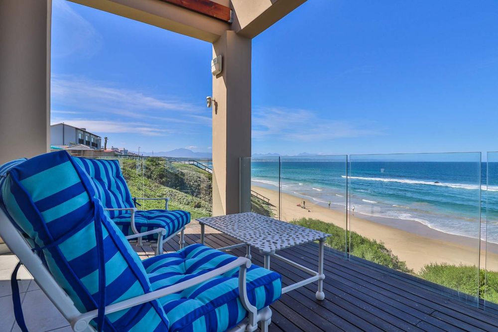 Upstairs, a private lounge opens onto additional stoep areas offering mesmerizing ocean views. The master bedroom boasts a 180-degree sea view, ample natural light, and an en-suite bathroom with luxurious finishes including a bath, shower, and basin.