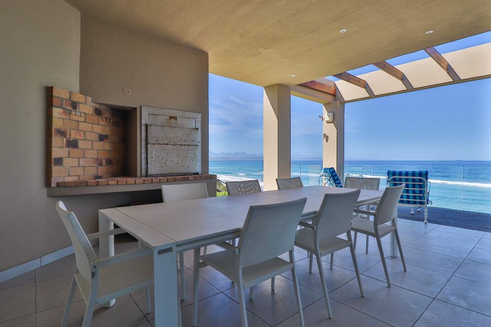 Designed for open-plan living, the spacious layout of the house ensures that every entertainment area, bedroom, and patio is graced with panoramic ocean vistas. On the ground level, a welcoming entrance area leads to a reception lounge and a modern kitchen with a separate scullery. The lounge seamlessly flows into a braai room with a built-in braai and bar, perfect for hosting gatherings while taking in the uninterrupted ocean views. The entertainment area flows seamlessly to the outside stoep area with an outside braai area with exquisite views to enjoy.