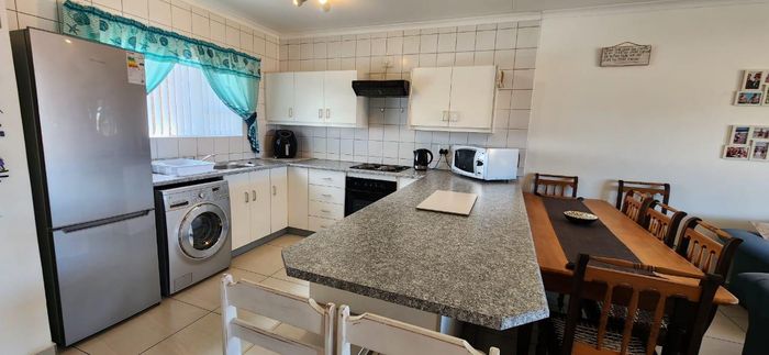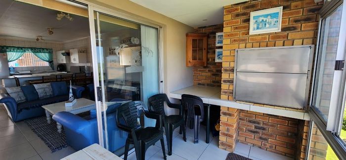 Coastal entertaining lifestyle in Seemeeupark, Mossel Bay, with open-plan living and a patio with built-in braai. Three bedrooms, 2.5 bathrooms and double automated garage.