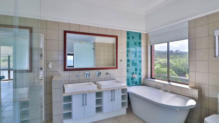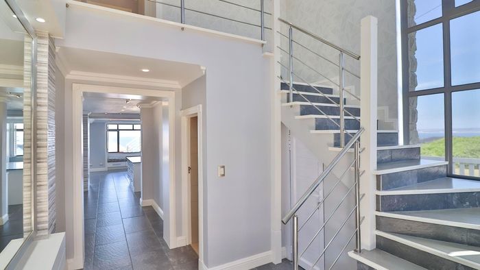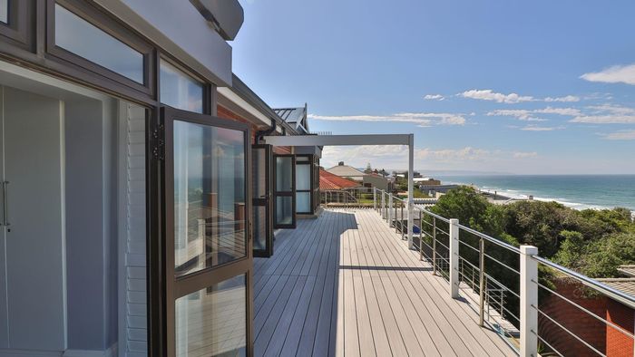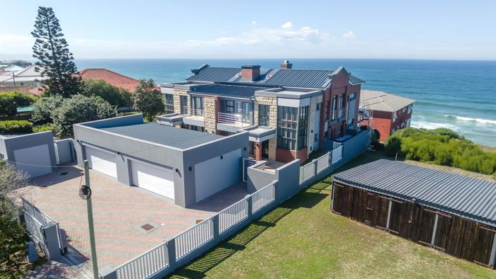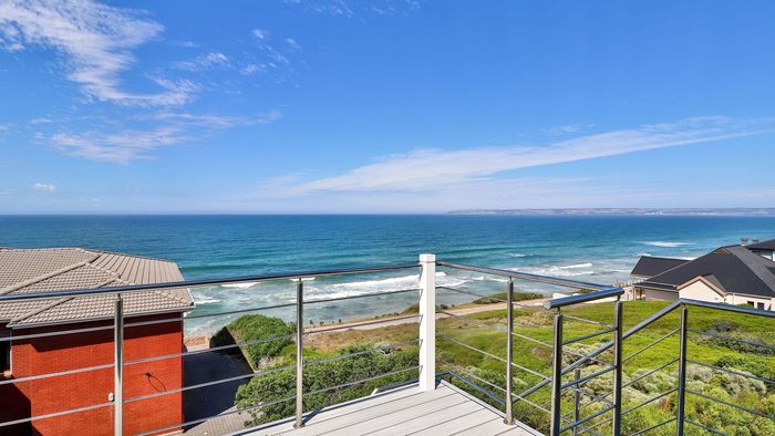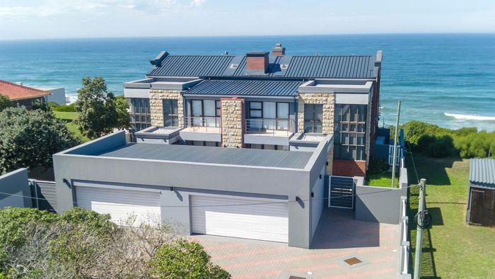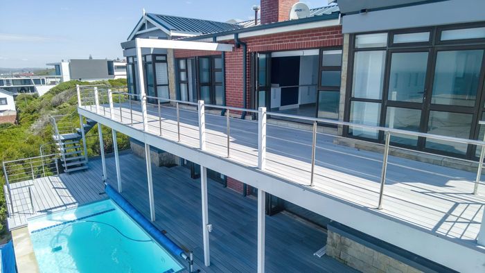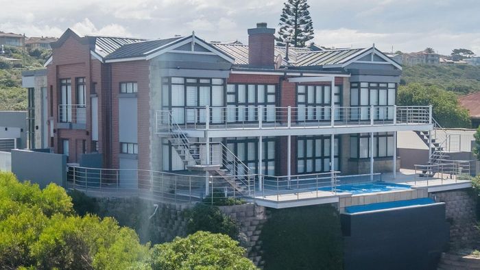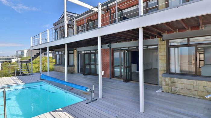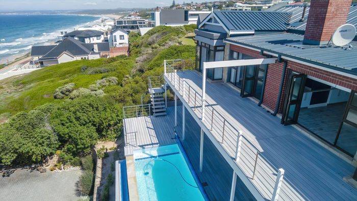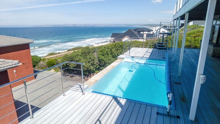 Coastal lifestyle and investment in quiet Reebok between George and Mossel Bay, sweeping sea views and infinity pool merging with the ocean. Two duets, 8 beds, 6 baths.