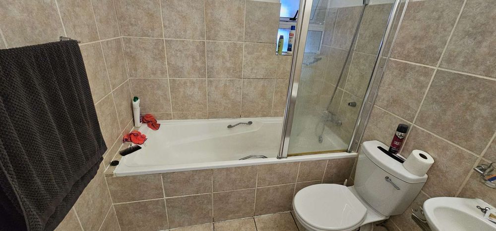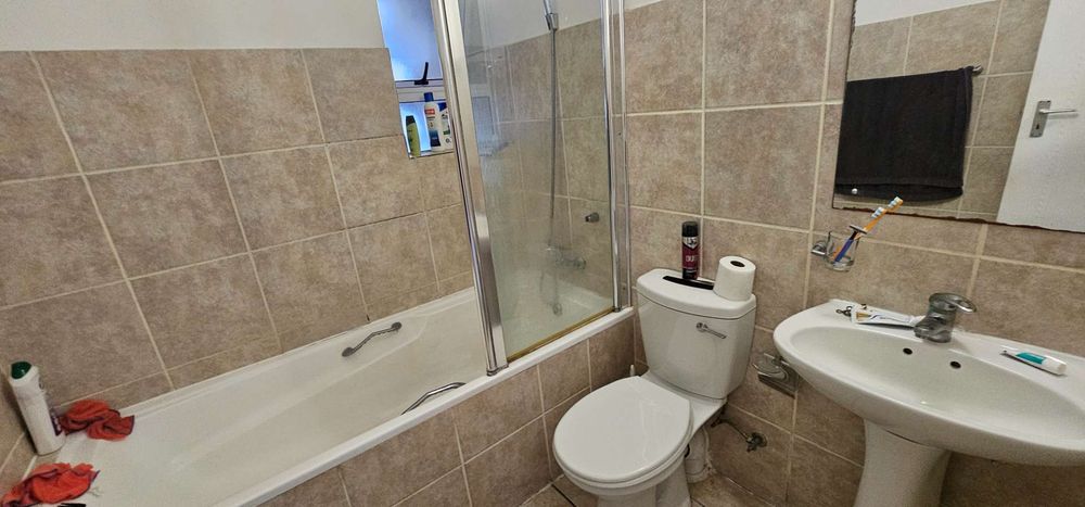 The apartment features two well-appointed bedrooms, with the main bedroom boasting an en suite bathroom equipped with a sleek shower. The second bathroom is full-sized and includes a bath with a shower above, catering to all your bathing preferences.