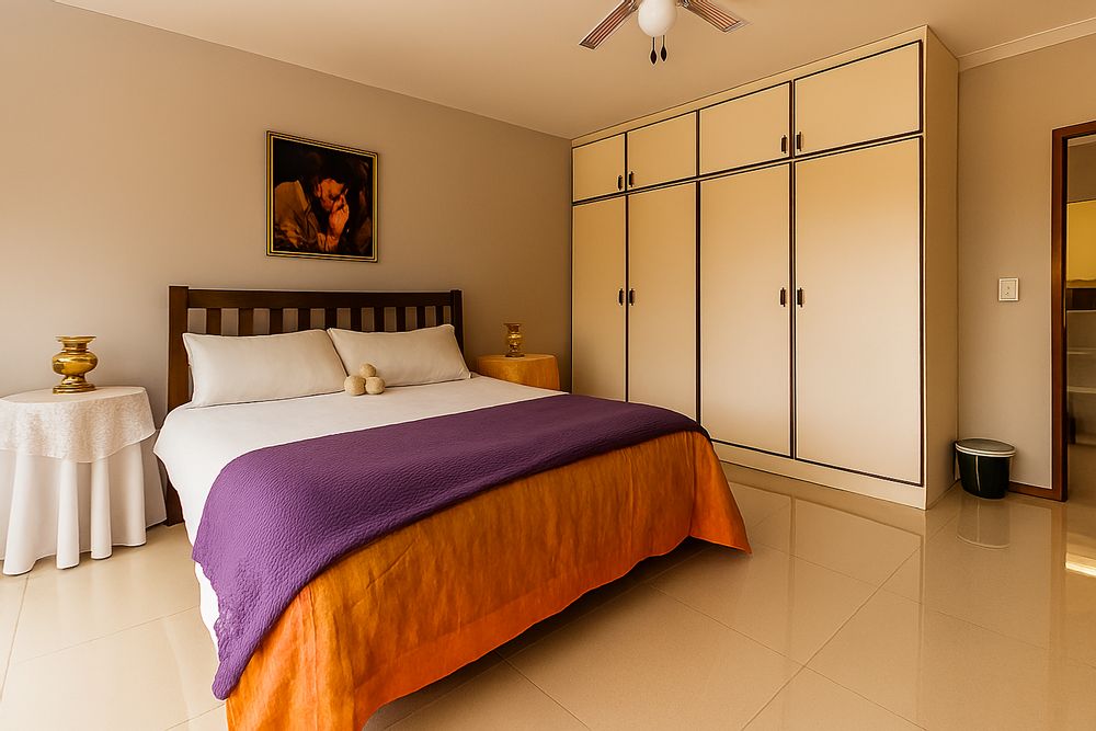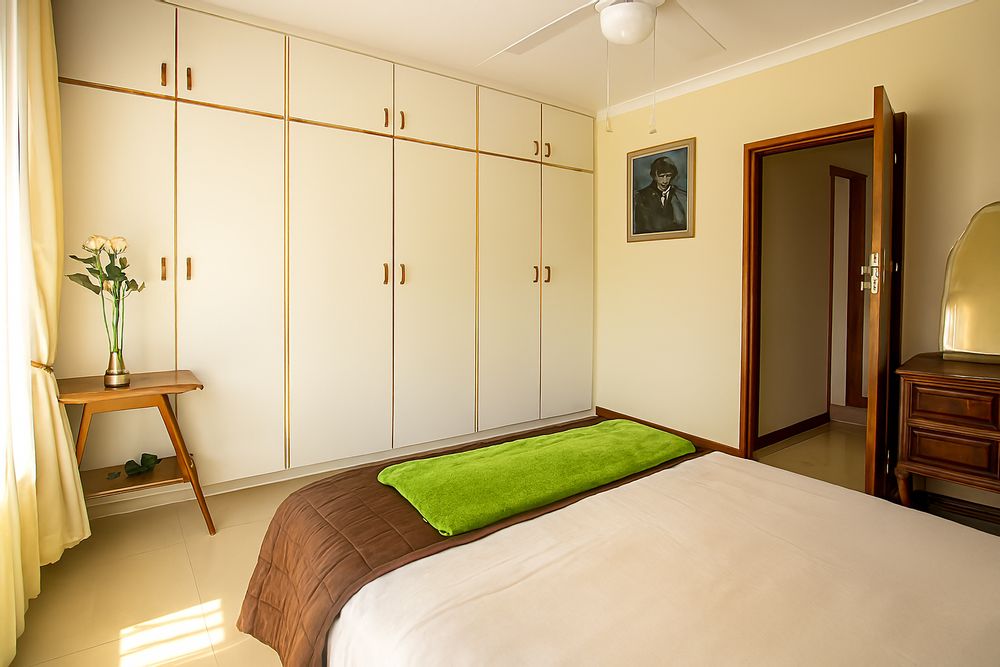 A hallway from the dining room leads you to three comfortable bedrooms and a large, full guest bathroom. The passage also provides access to a convenient laundry room. At the end of the hallway, you'll find the expansive main bedroom, featuring ample cupboard space and an en-suite bathroom. The main bedroom opens up to a balcony, offering a peaceful retreat with stunning views.
