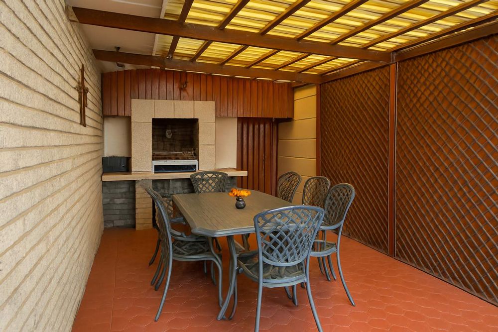 The living room flows into the well-appointed kitchen, which is adjoined by a dining room. From the kitchen, a door opens to an outdoor covered patio equipped with another built-in braai, making it an ideal spot for al fresco dining.