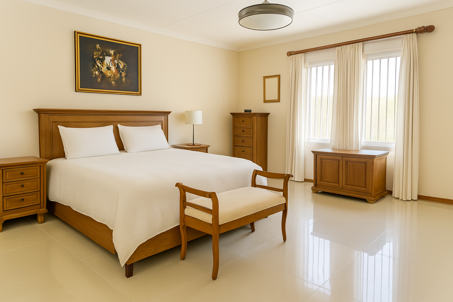 Enter through the front door into a generously sized living room that seamlessly transitions into the braai/entertainment room. Here, you’ll find a built-in braai and stunning ocean views, perfect for entertaining guests or enjoying a relaxing evening.