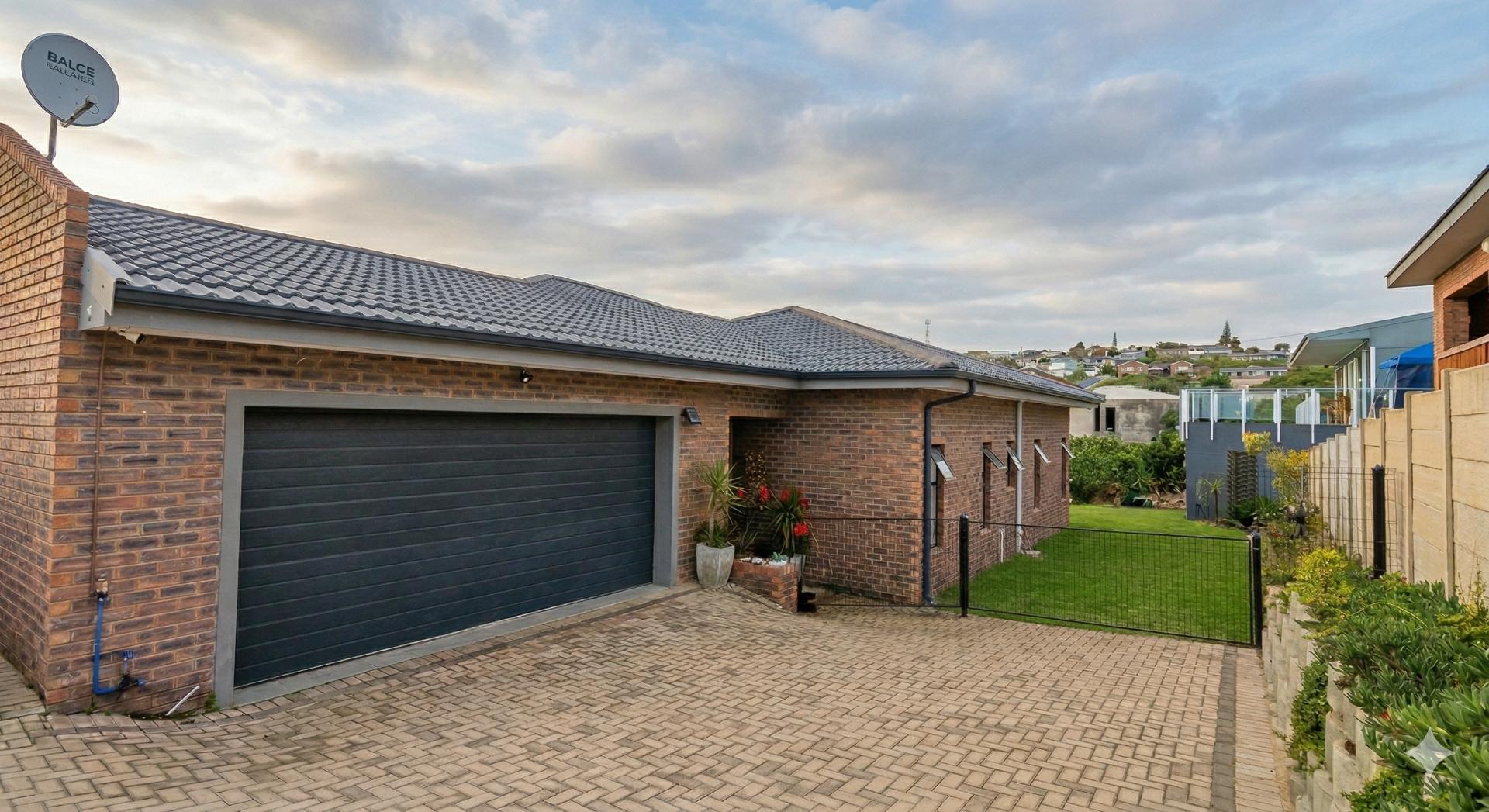 The home features an open-plan living and dining area with built-in braai, that flows naturally into a modern kitchen.