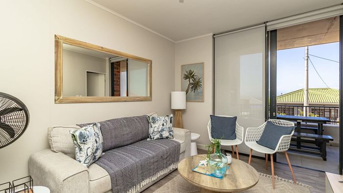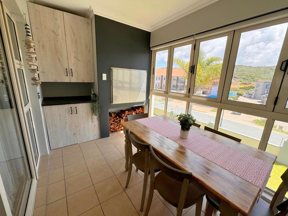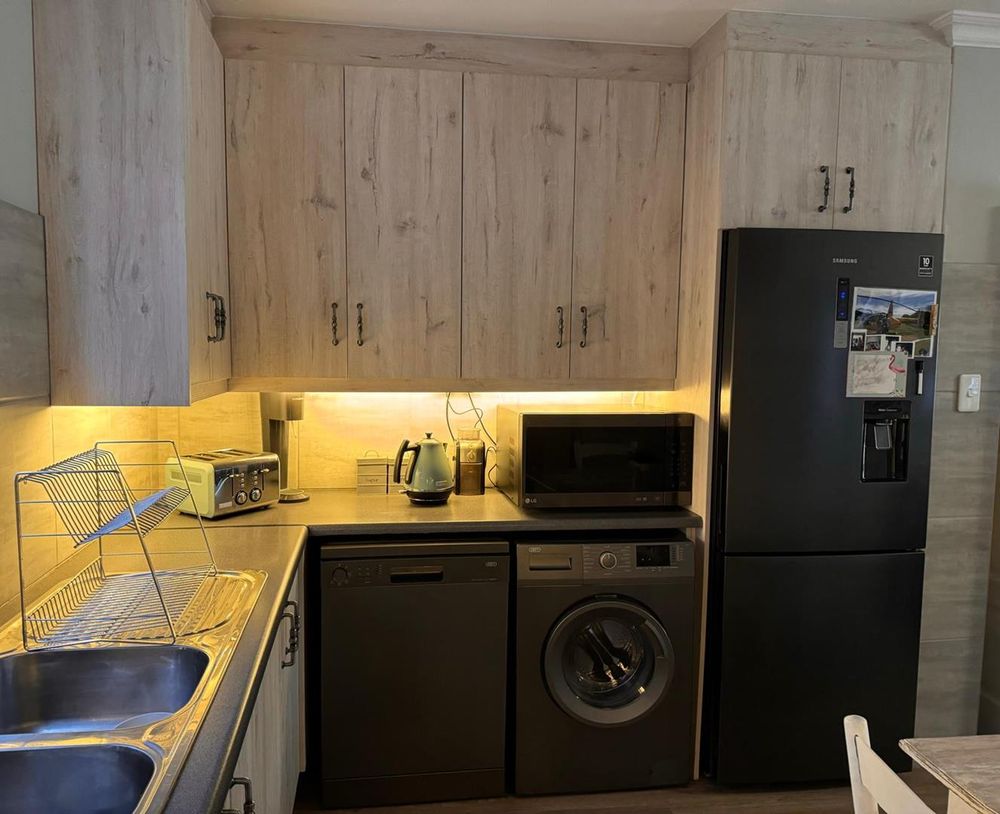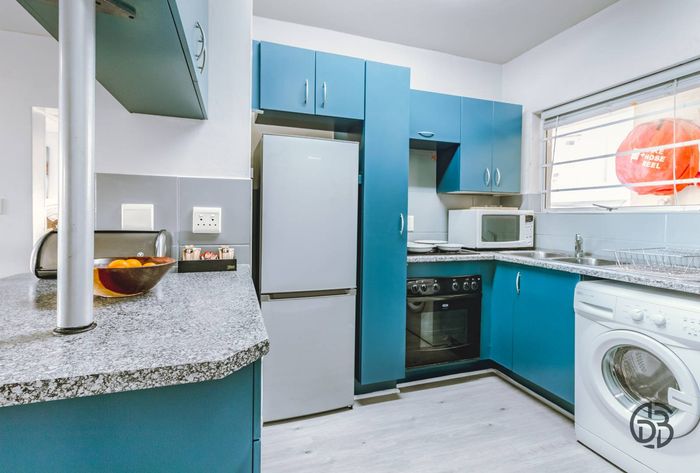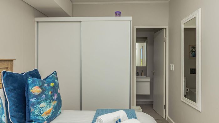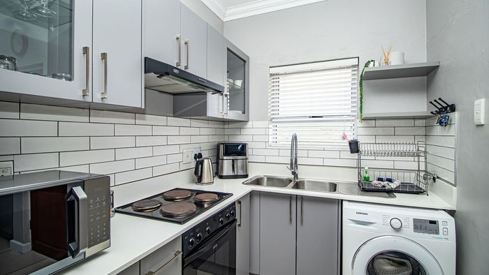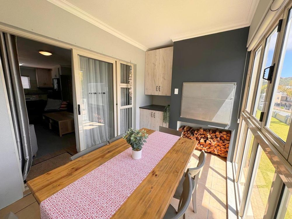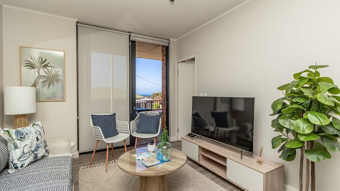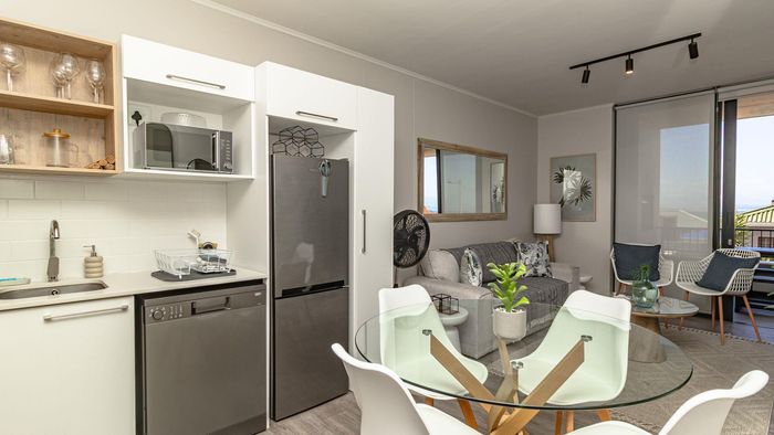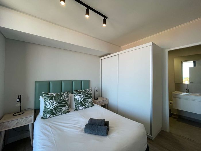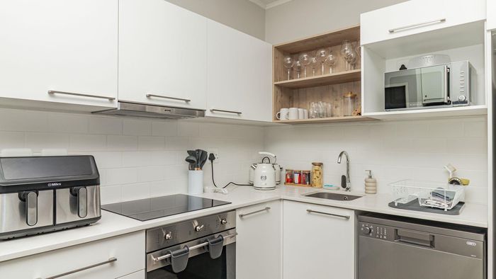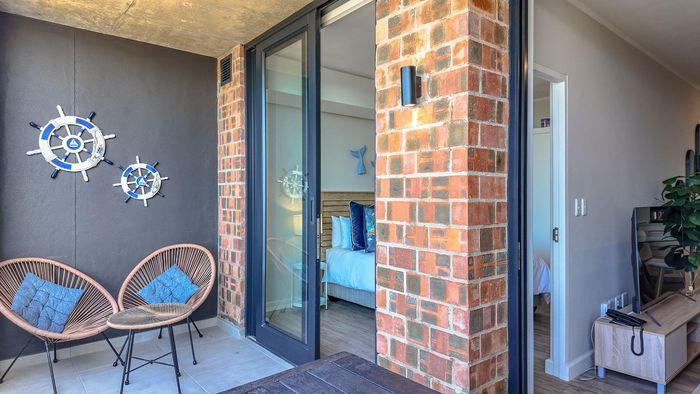 Step inside to find a meticulously designed space, complete with all the furniture, modern appliances, cutlery, linen, and decor you need to feel right at home. The heart of the apartment is the modern kitchen, which boasts ample cupboards and seamlessly flows into an open-plan living area. This inviting space extends onto an enclosed braai balcony, complete with a stainless steel braai, perfect for entertaining guests or enjoying quiet evenings at home.