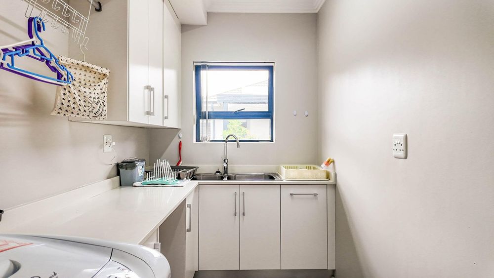 The modern kitchen, complemented by a functional scullery and a sunny courtyard, is ideal for culinary enthusiasts. The home’s north-facing orientation ensures plenty of natural light, and being situated on a corner lot provides ample parking space for visitors. The double garages add even more convenience.