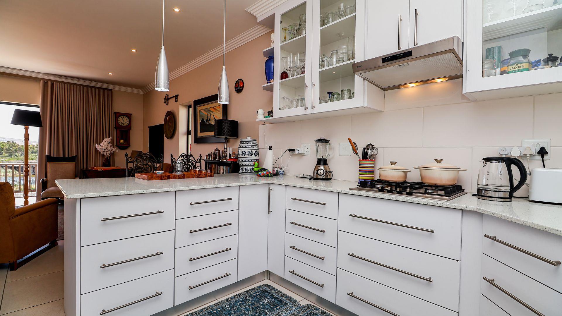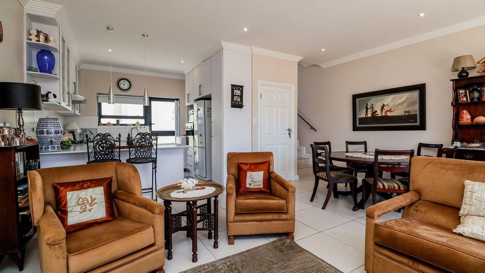 The ground level of this charming home features an open-plan design that seamlessly connects the dining and living areas with a well-equipped kitchen and a dedicated braai area, perfect for entertaining family and friends.