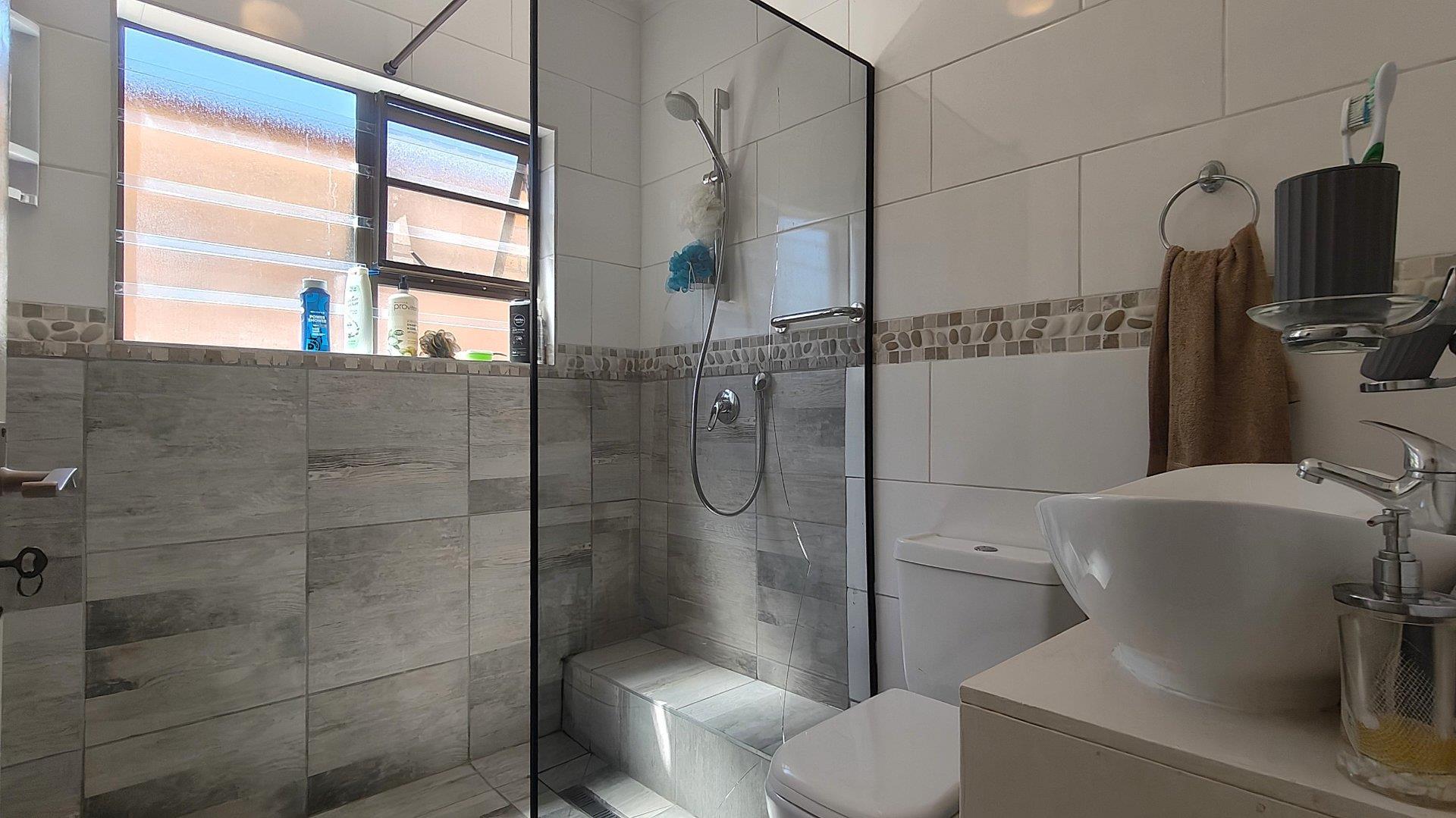 The home features two well-sized bedrooms with built-in cupboards, serviced by a modern bathroom fitted with a shower, basin, and toilet.