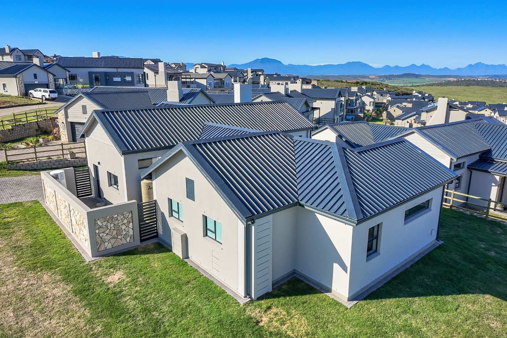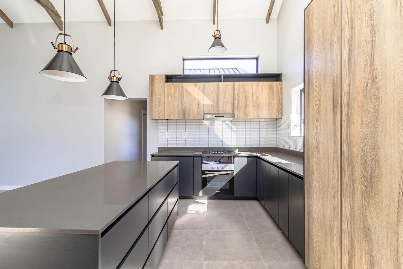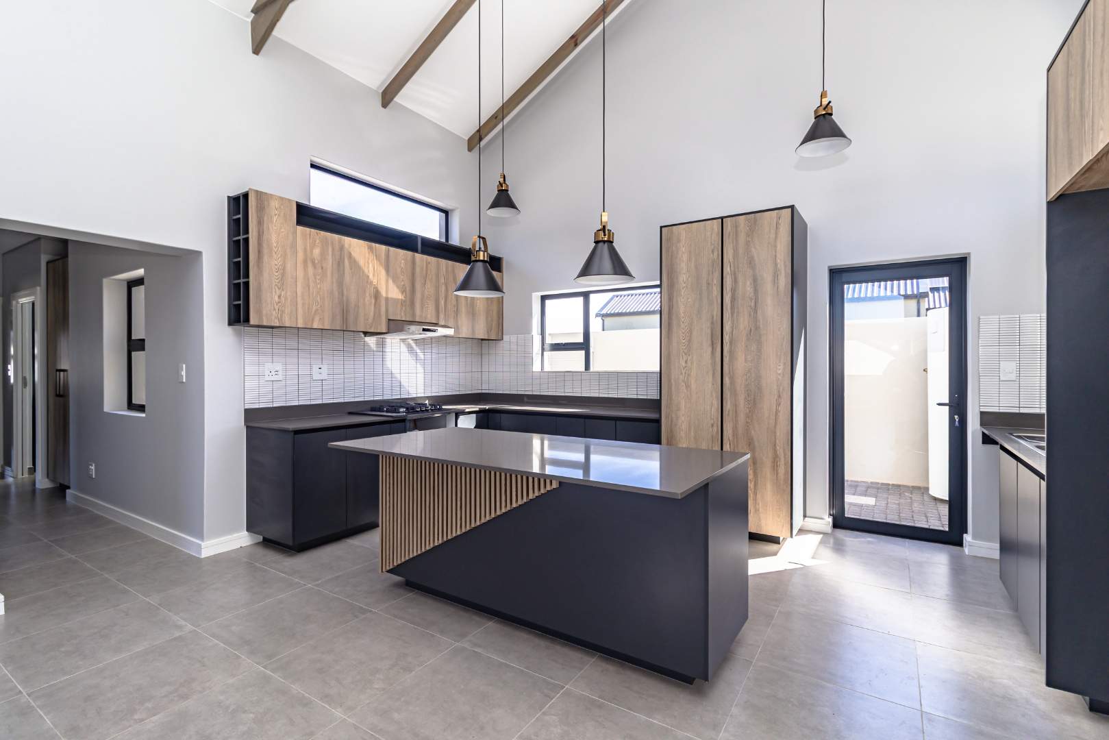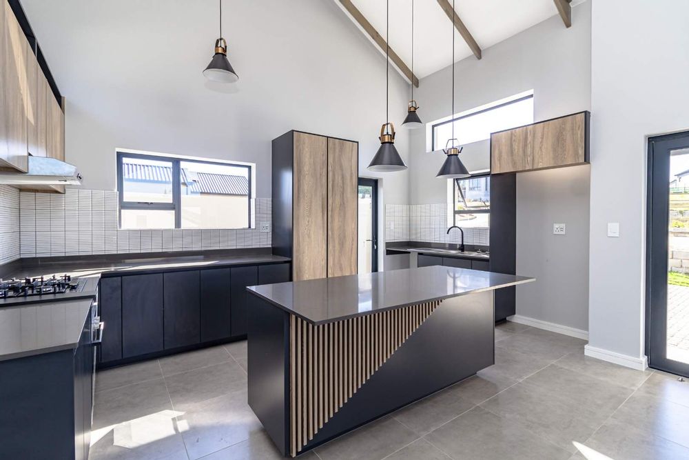 The open-plan living area also features an indoor braai area, making it ideal for entertaining guests regardless of the weather. The modern kitchen is a chef’s delight, equipped with a gas hob, electric oven, and ample cupboard space to cater to all your culinary needs.