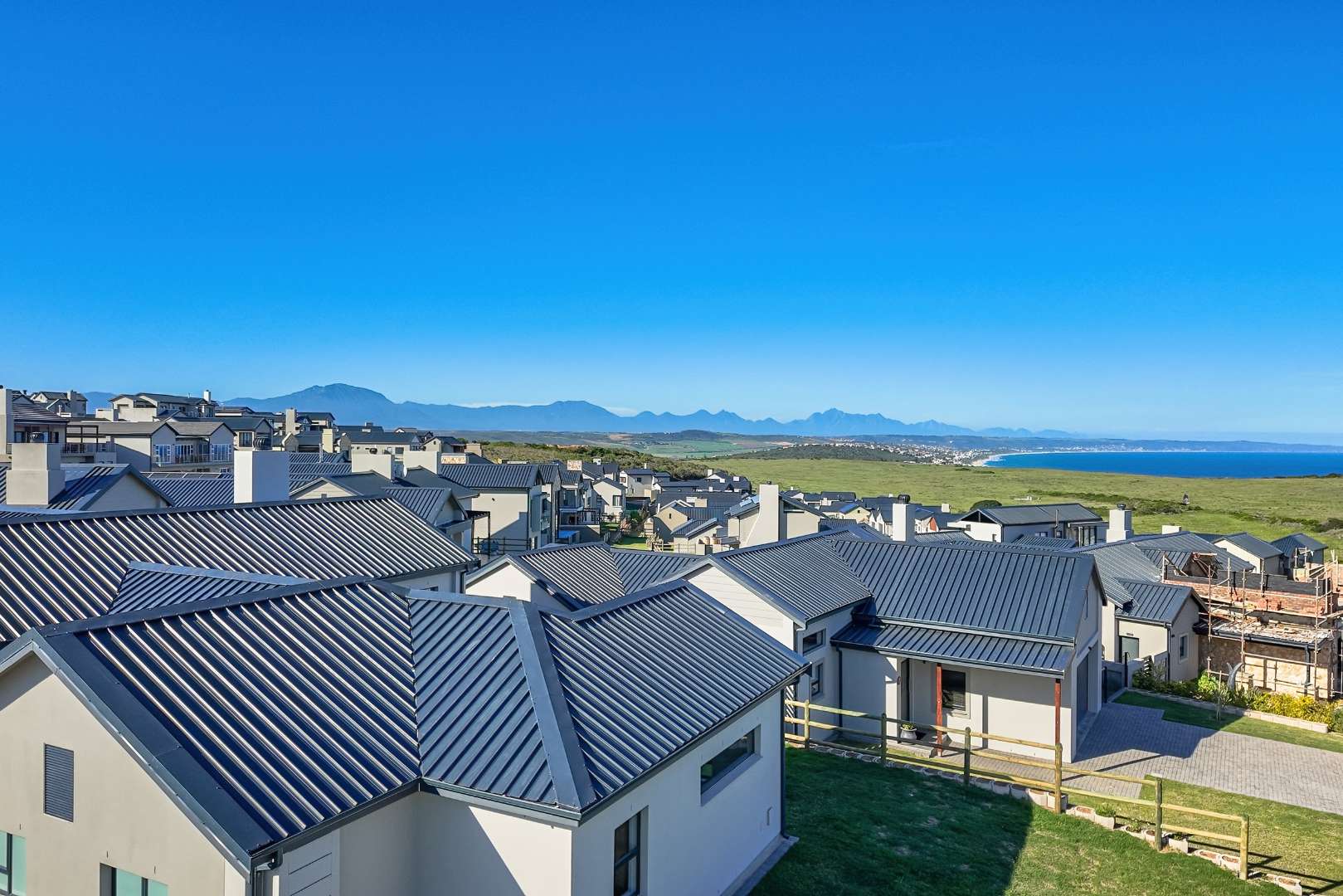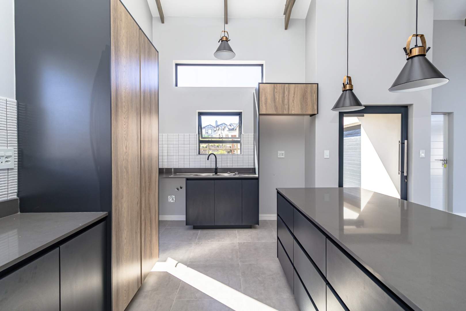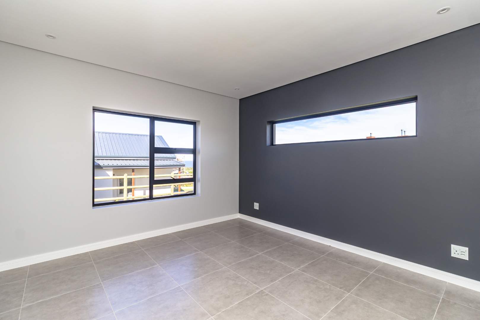 The open-plan living area also features an indoor braai area, making it ideal for entertaining guests regardless of the weather. The modern kitchen is a chef’s delight, equipped with a gas hob, electric oven, and ample cupboard space to cater to all your culinary needs.