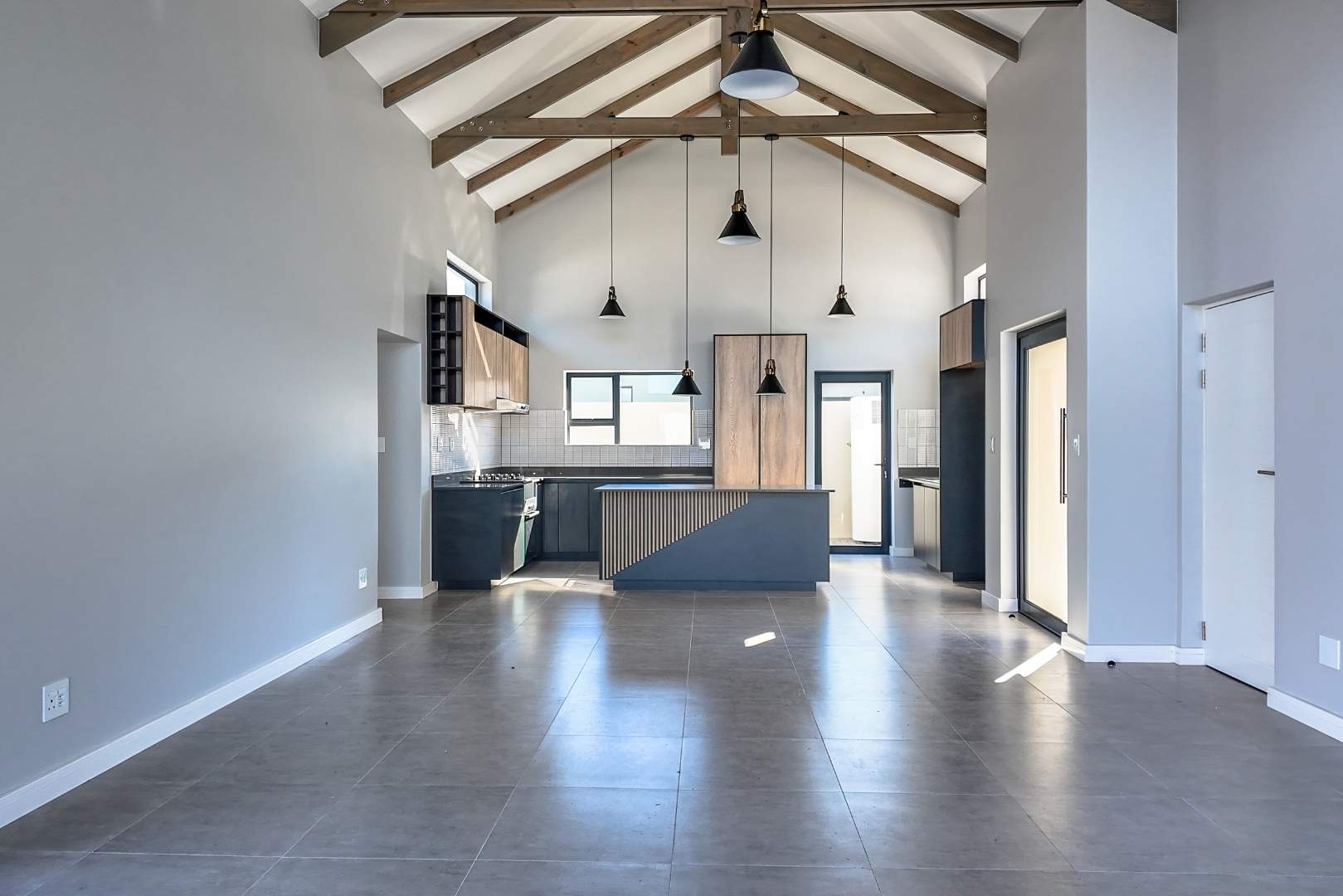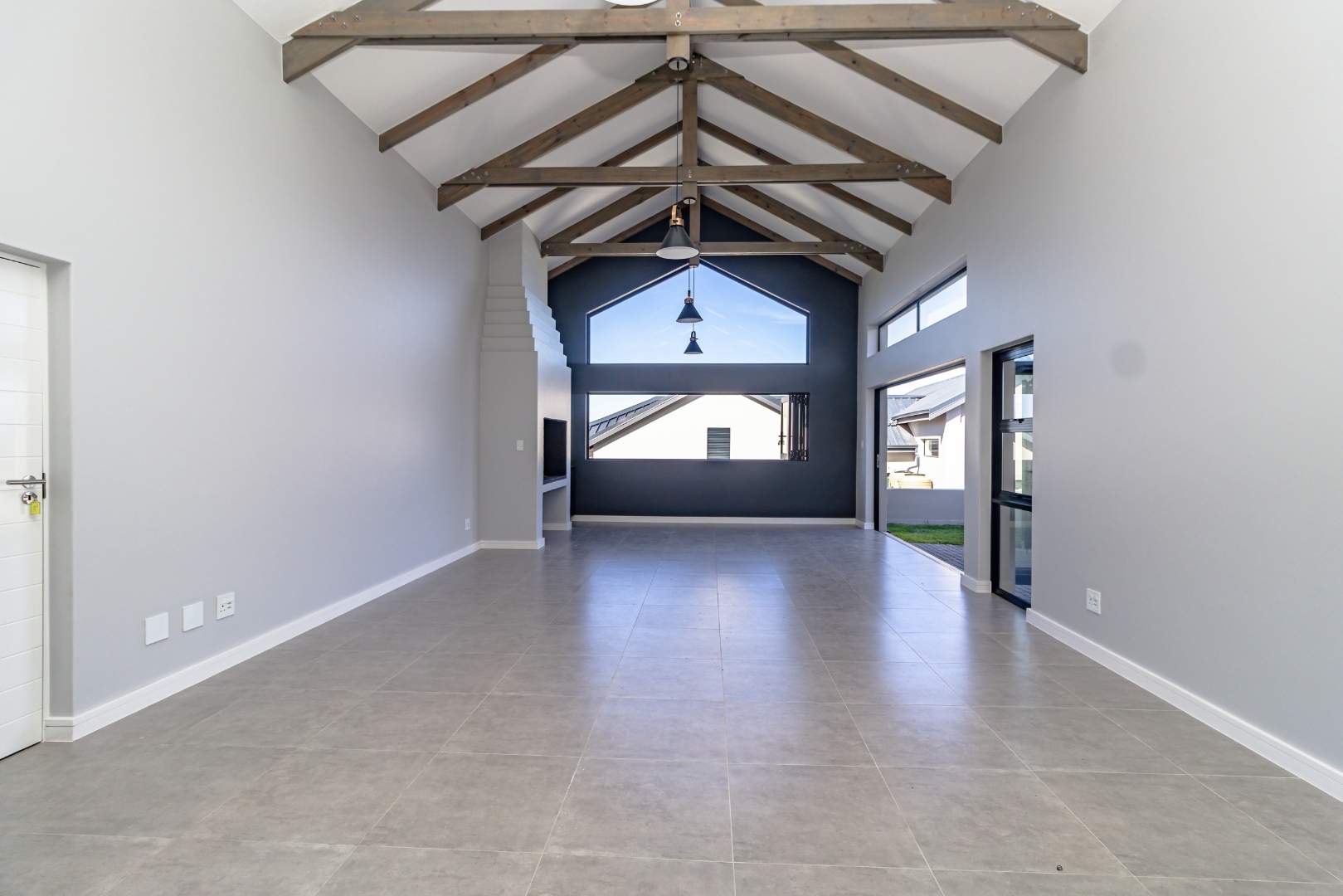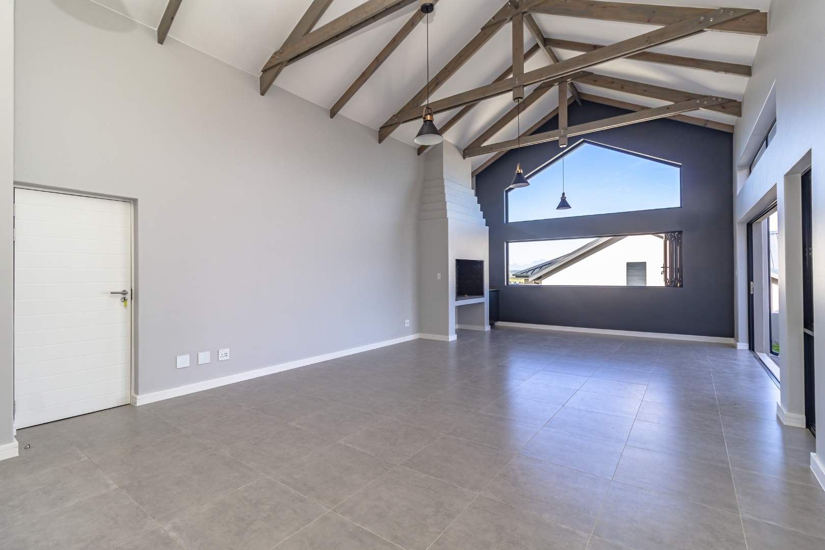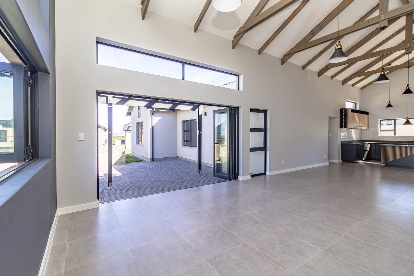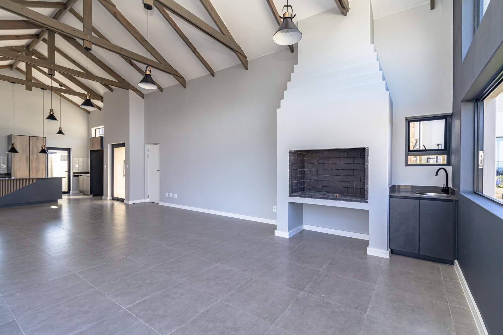 As you step inside, you'll be greeted by a spacious open-plan living room that boasts high ceilings with exposed beams, creating an airy and inviting atmosphere. The ample natural light floods the room, providing a warm and welcoming environment for family gatherings and entertainment. Stacker doors seamlessly extend your living space to the outdoors, leading to a charming braai boma, perfect for enjoying alfresco dining and the beautiful surroundings.