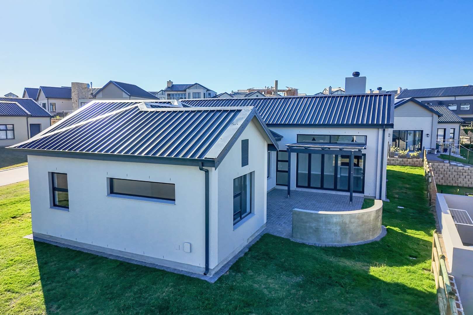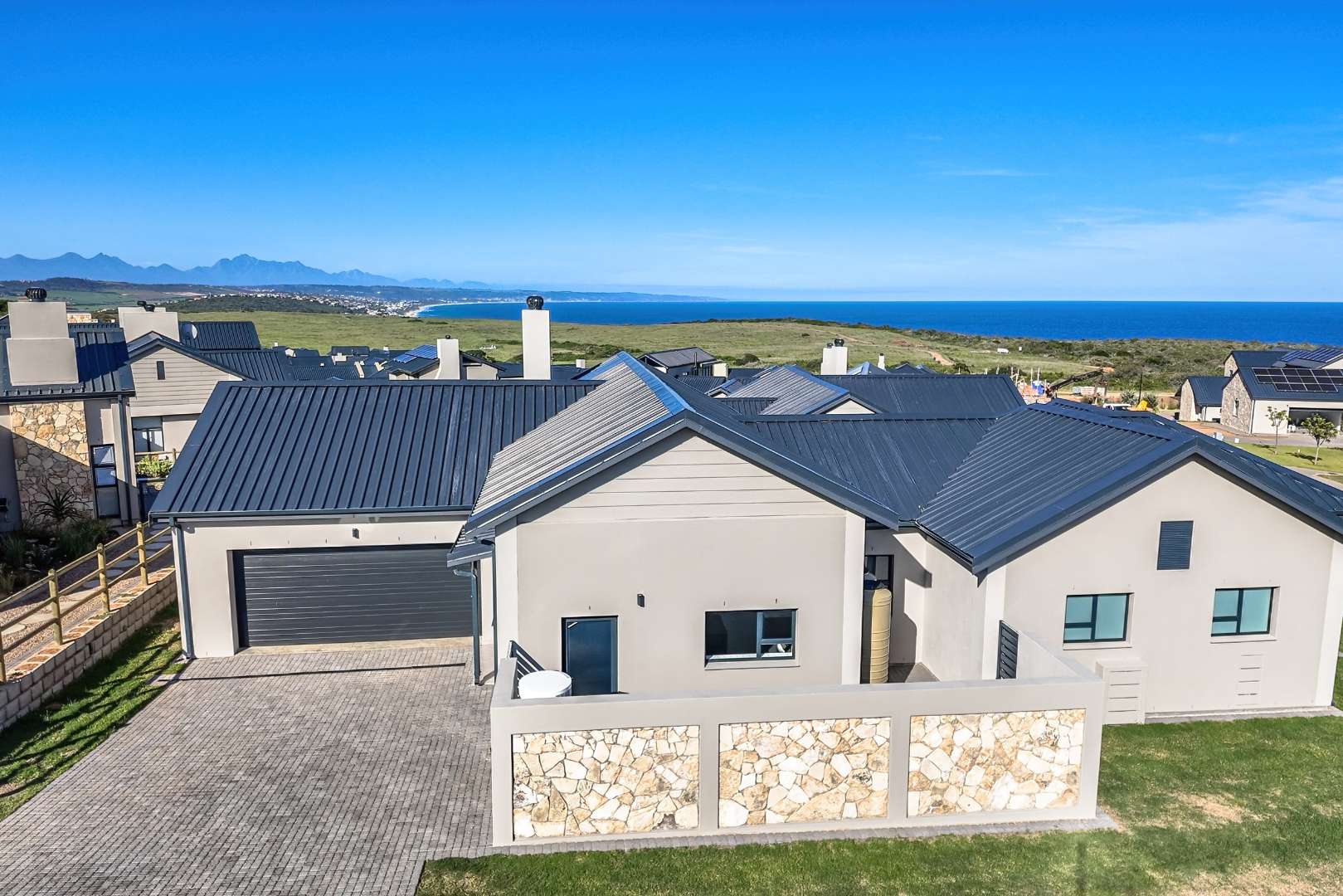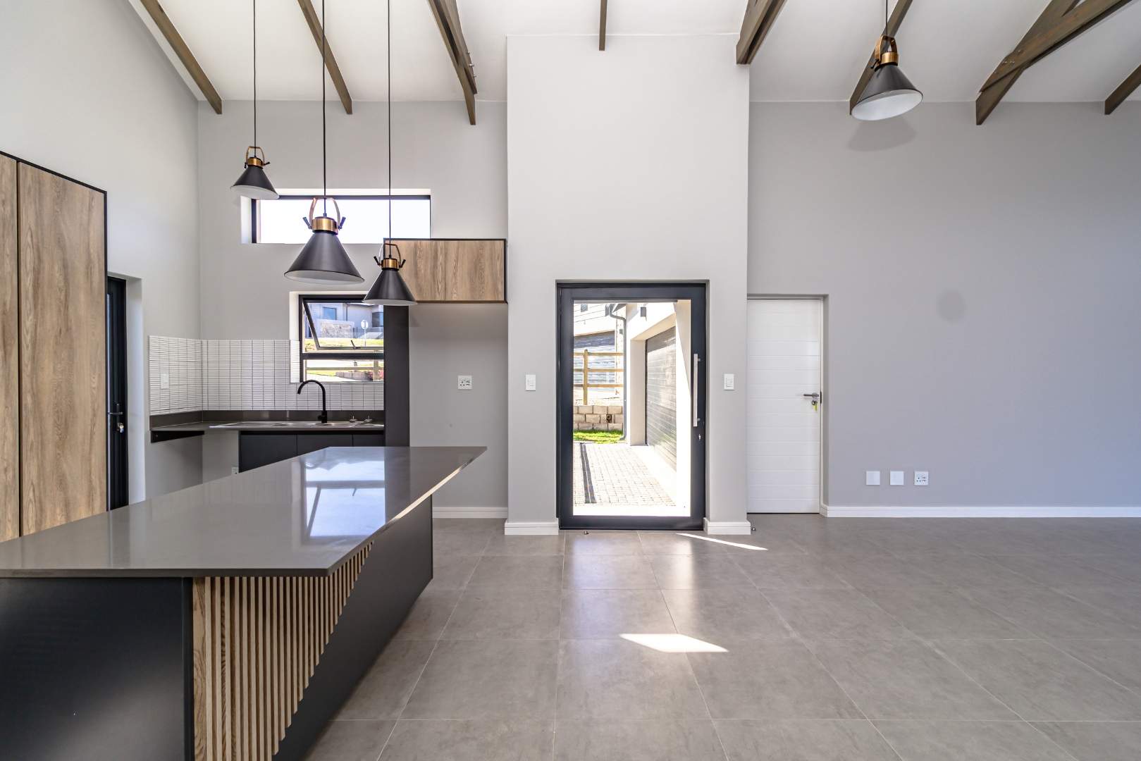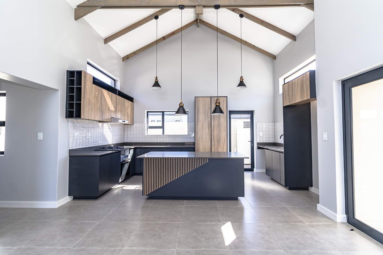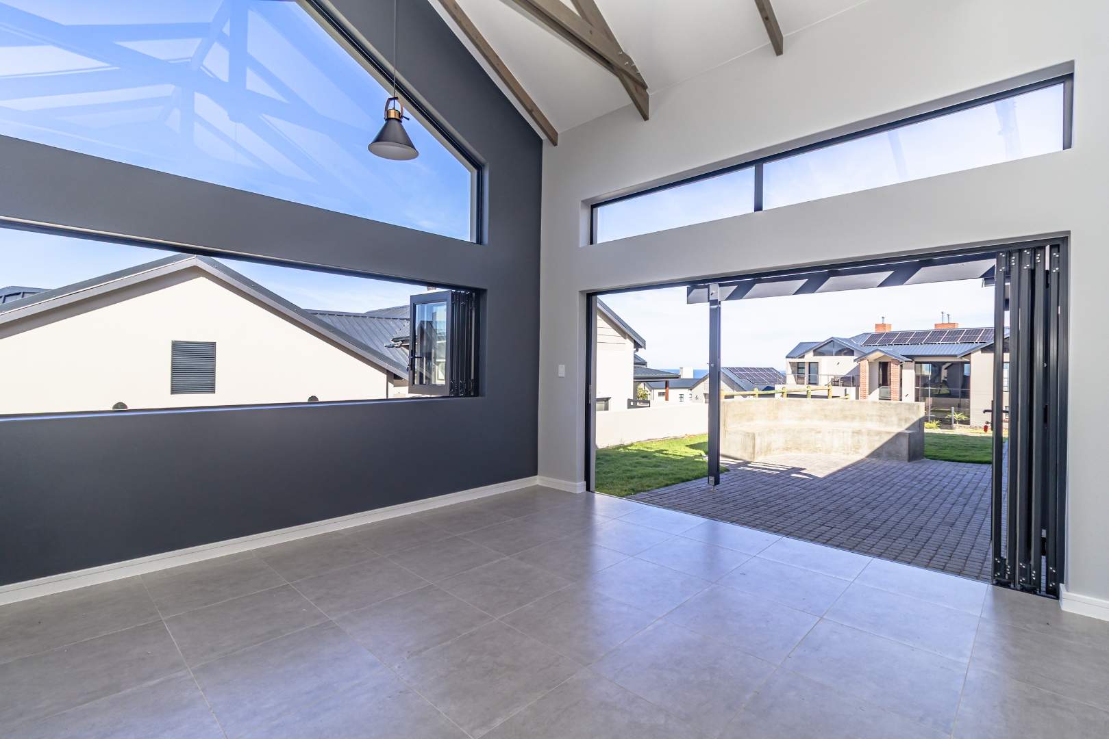 As you step inside, you'll be greeted by a spacious open-plan living room that boasts high ceilings with exposed beams, creating an airy and inviting atmosphere. The ample natural light floods the room, providing a warm and welcoming environment for family gatherings and entertainment. Stacker doors seamlessly extend your living space to the outdoors, leading to a charming braai boma, perfect for enjoying alfresco dining and the beautiful surroundings.