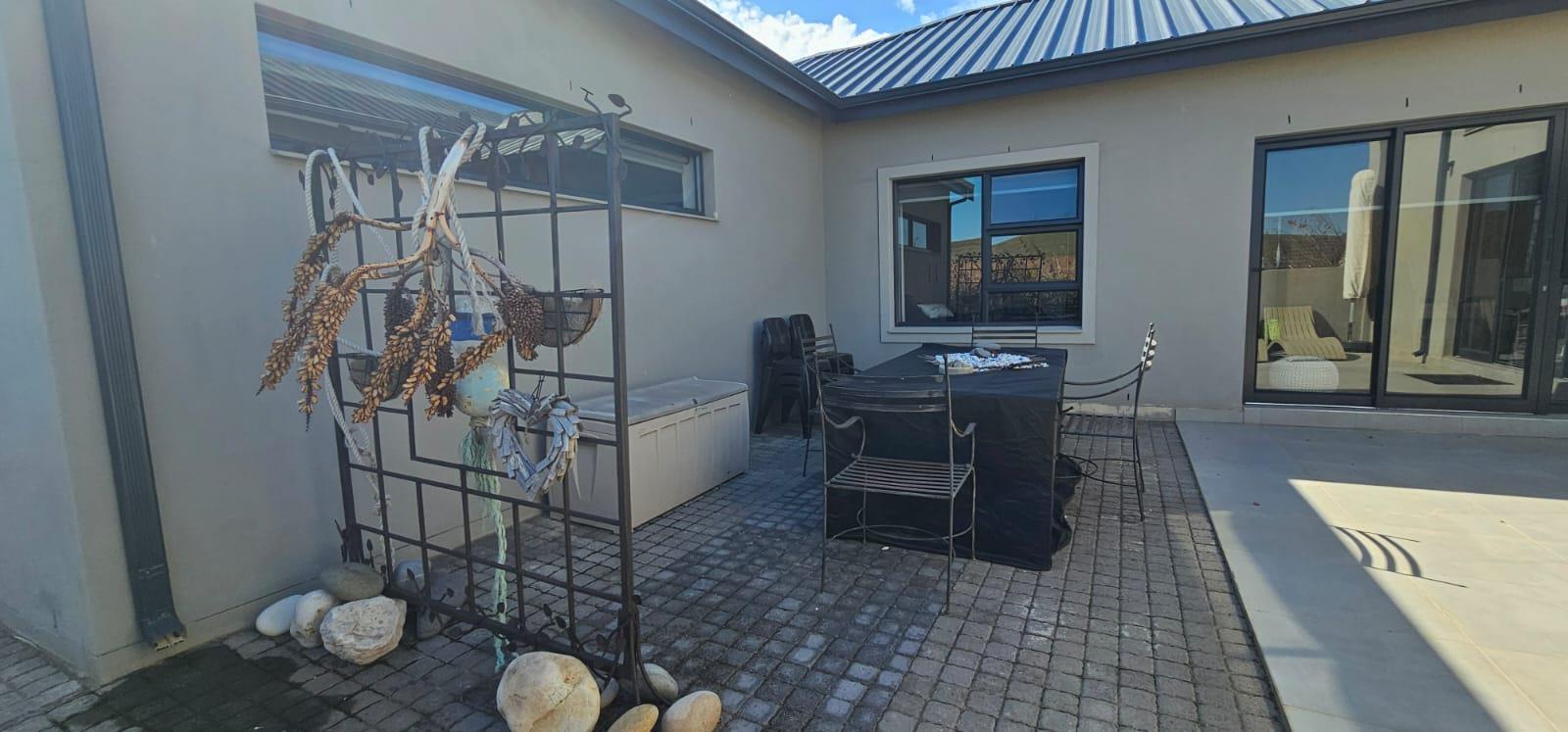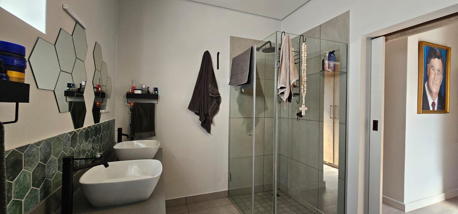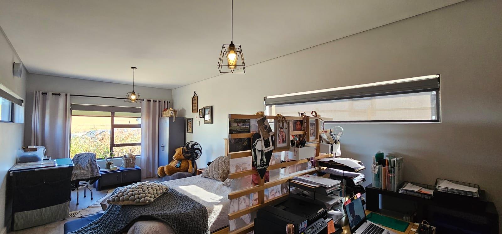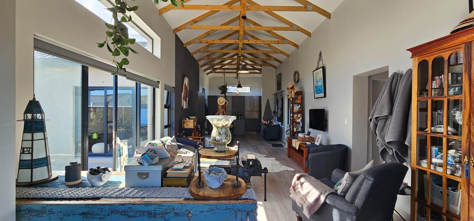 Adding to the home's grandeur are the striking open trusses, which enhance the sense of spaciousness and provide an airy atmosphere where you can unwind in style. A guest toilet is conveniently located for visitors. The living area is designed for entertaining, featuring a cozy indoor braai—perfect for hosting memorable gatherings with family and friends.