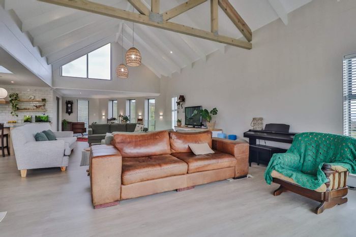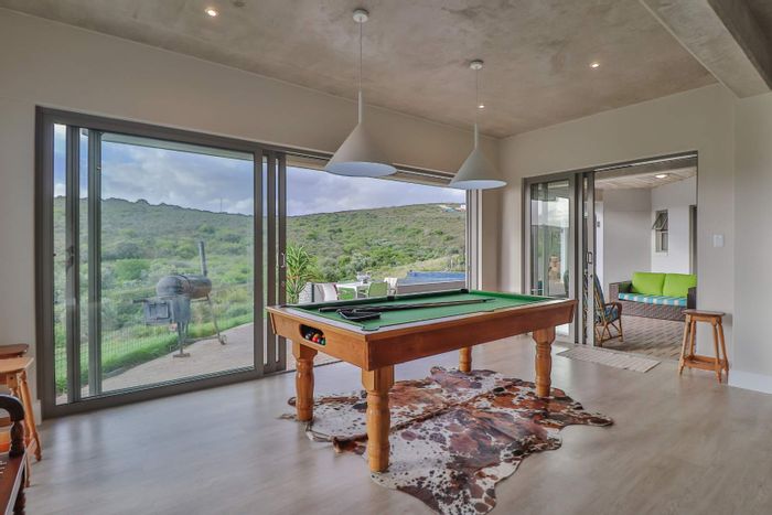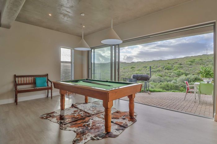 Safari-inspired living on Outeniquasbosch Wildlife Estate, minutes from Hartenbos and George — indoor heated pool with braai and boma for game viewing; four-bedroom, four-and-a-half-bath home.
