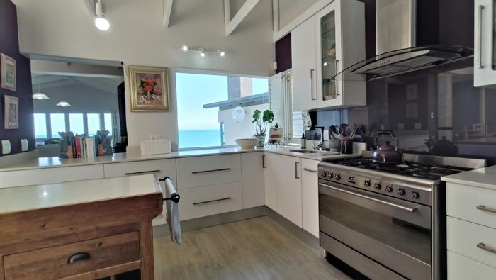 Seaside living with direct beach access and sweeping breaker views from nearly every room; expansive kitchen with scullery and built-in braai, private garden, four bedrooms, three baths.