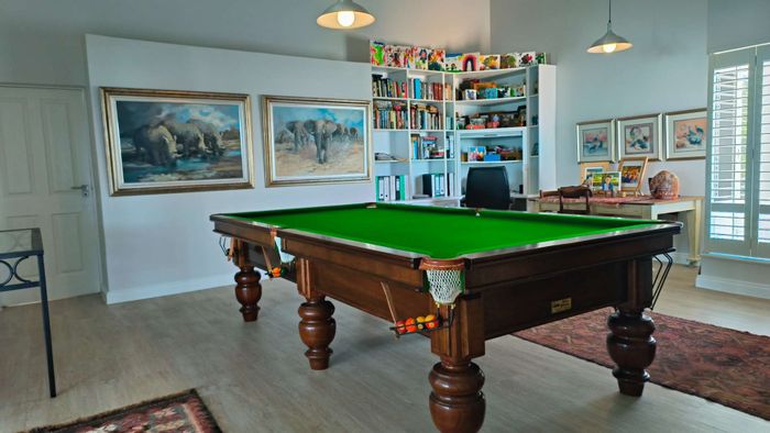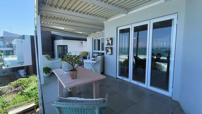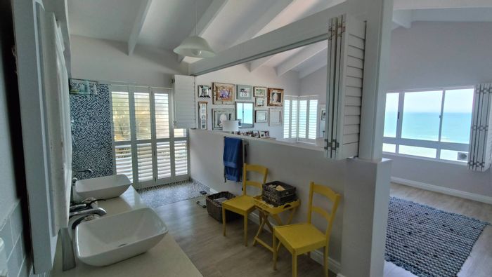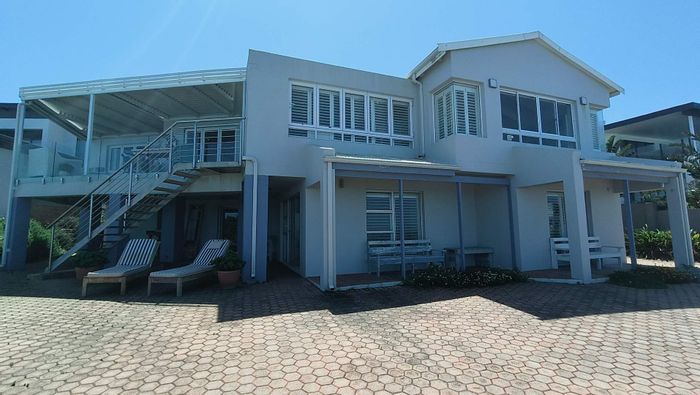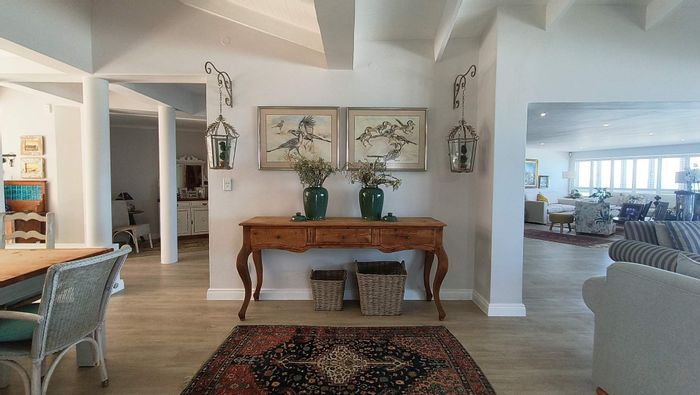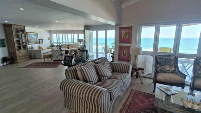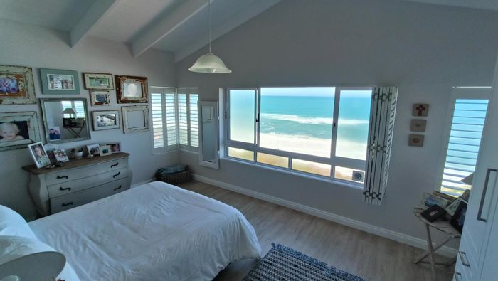 Embrace Dana Bay coastal living with easy B&B potential — expansive 180° ocean-view balcony and upstairs entertainment lounge with built-in braai; five bedrooms, four bathrooms and four garages.