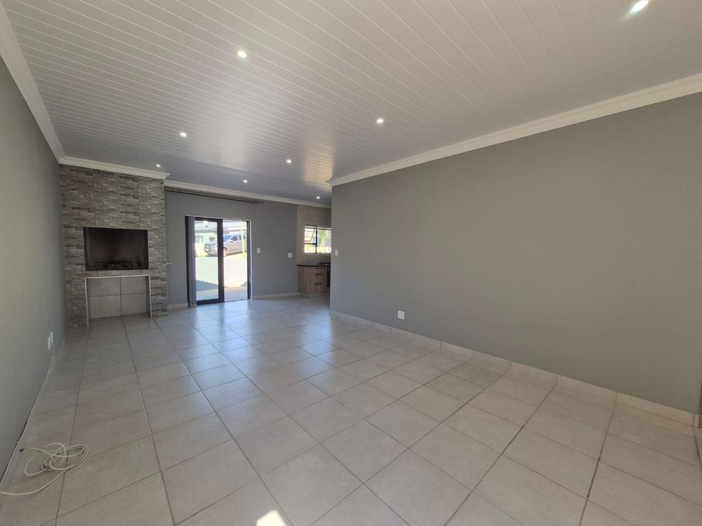 The property boasts a modern open-plan kitchen equipped with built-in cupboards, a sleek gas hob, and an electric oven, making it a delight for culinary enthusiasts. Adjacent to the kitchen is a spacious lounge area featuring a built-in braai, perfect for entertaining family and friends.
