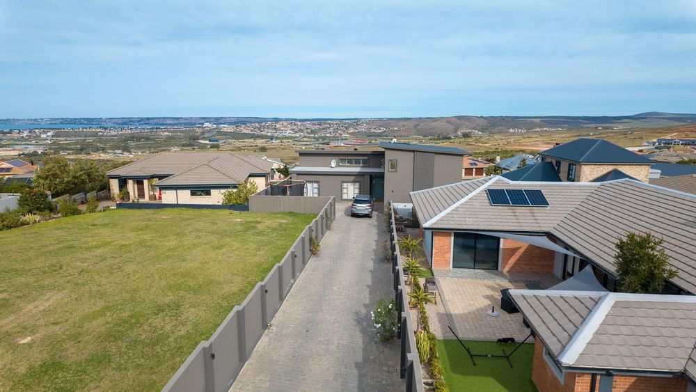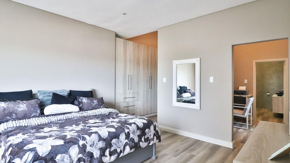 For entertainers, the braai room is a standout, offering a built-in bar area and stainless steel braai, with stacker doors that open onto the patio. Here, you'll discover the luxury of a heated rimless splash pool with multi-colored lights—perfect for gatherings or relaxation.