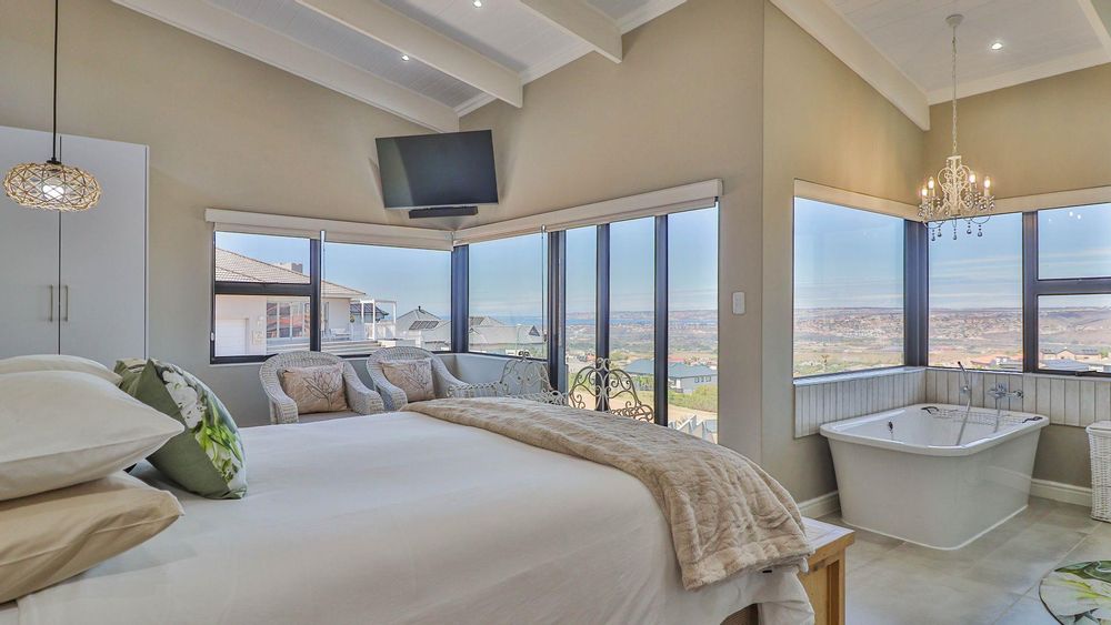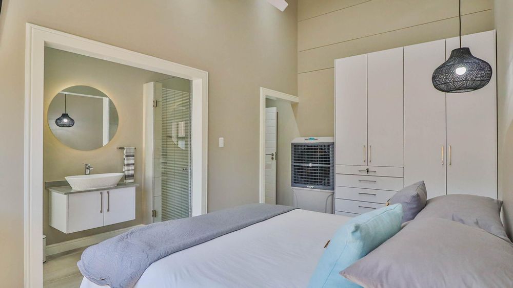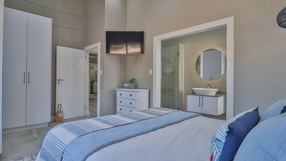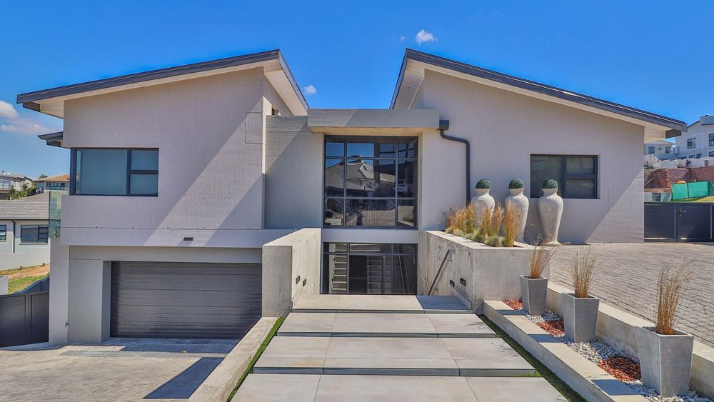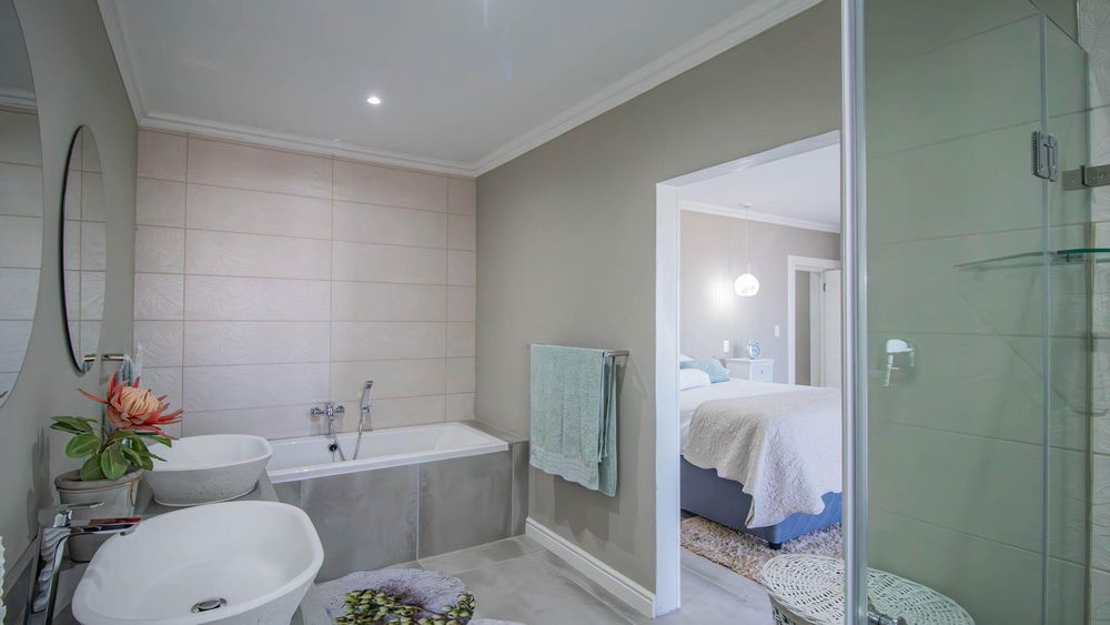 The living room extends to an outdoor braai area, ideal for sunny days and al fresco dining. On the entry level, discover the spacious main bedroom with a beautiful en-suite bathroom and stunning sea views. This serene retreat opens onto a patio that leads to a sparkling pool area, offering tranquility and relaxation. The main bedroom offers an en-suite bathroom with his and hers basin areas with exquisite finishes.