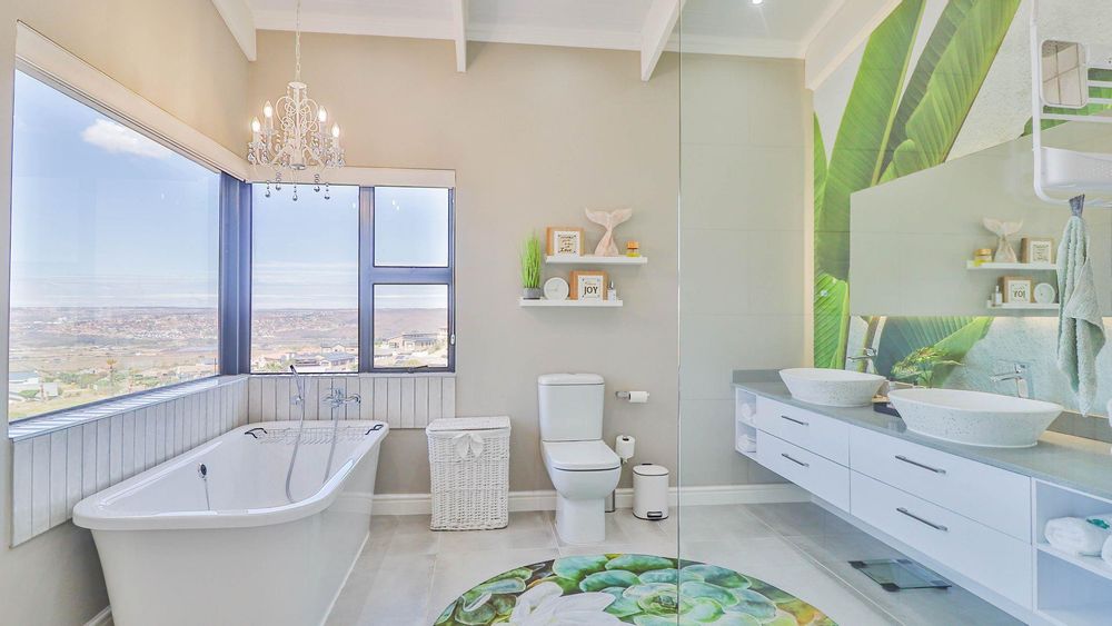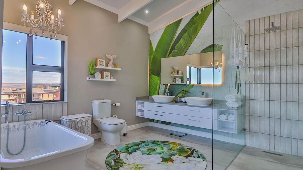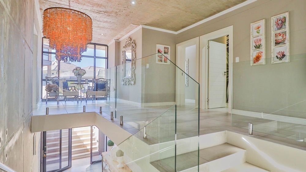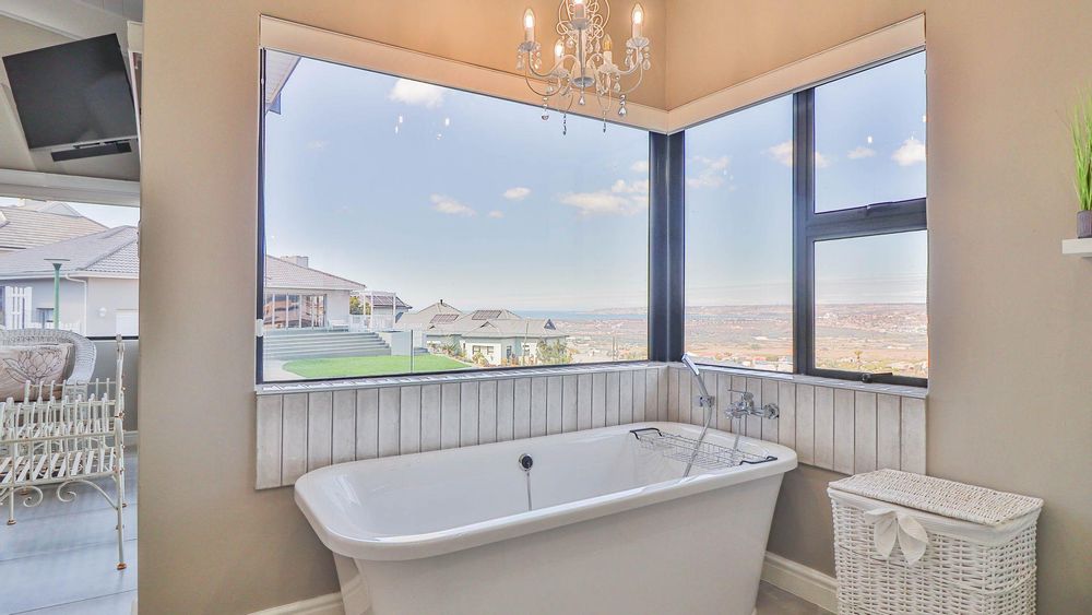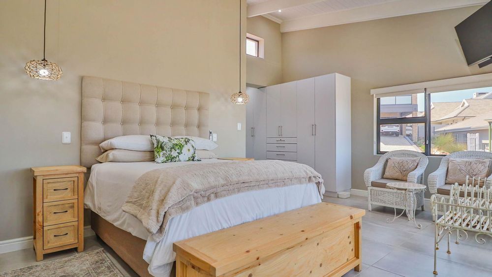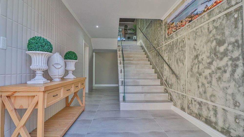 The living room extends to an outdoor braai area, ideal for sunny days and al fresco dining. On the entry level, discover the spacious main bedroom with a beautiful en-suite bathroom and stunning sea views. This serene retreat opens onto a patio that leads to a sparkling pool area, offering tranquility and relaxation. The main bedroom offers an en-suite bathroom with his and hers basin areas with exquisite finishes.