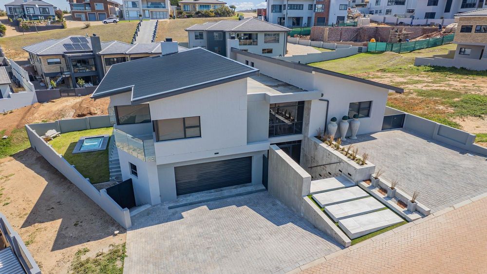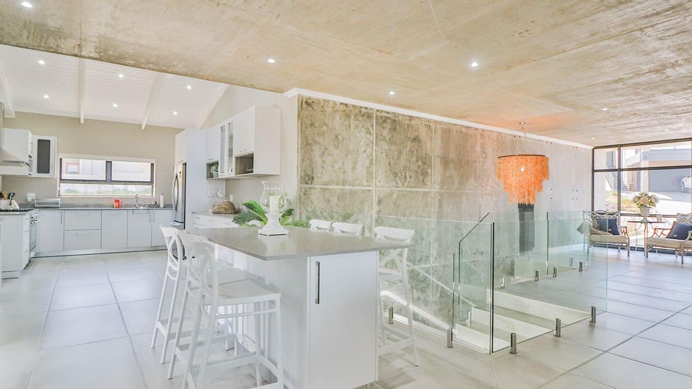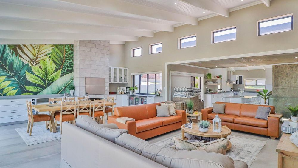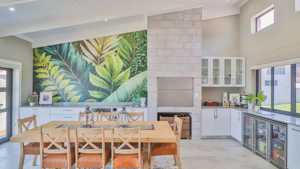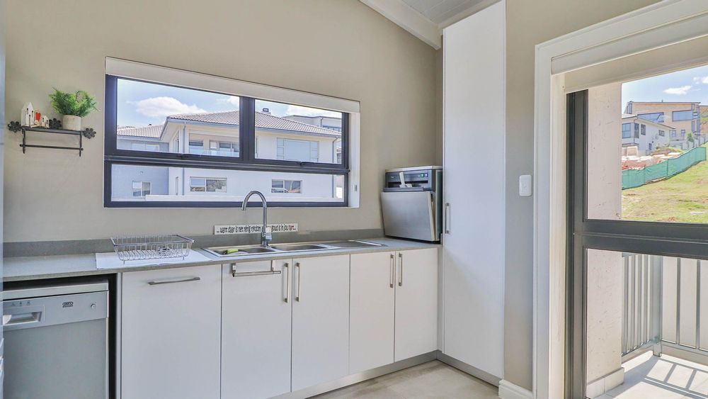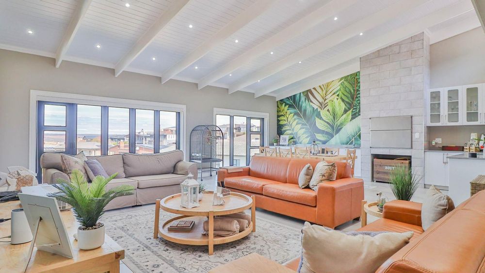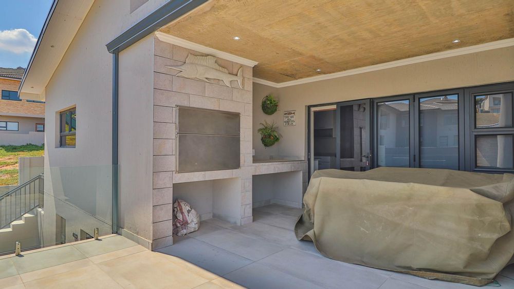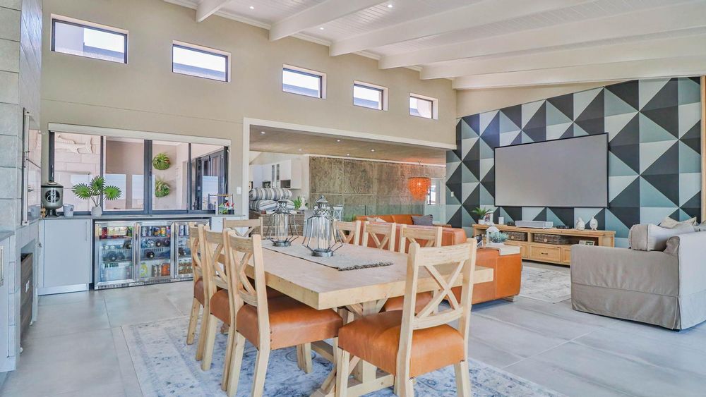 The heart of the home is the open-plan living area, complete with a built-in braai that seamlessly flows into the modern designer kitchen. Here, you'll find exquisite finishes and Caesarstone countertops, along with a separate scullery and pantry for added convenience. The living area opens up with scatter doors to the open stoep area with an exterior built-in braai, providing easy access to the pool area. The living room offers breathtaking sea views, enhancing the indoor-outdoor living experience. The dining room is elegantly integrated into this space, perfect for entertaining guests or enjoying family meals.