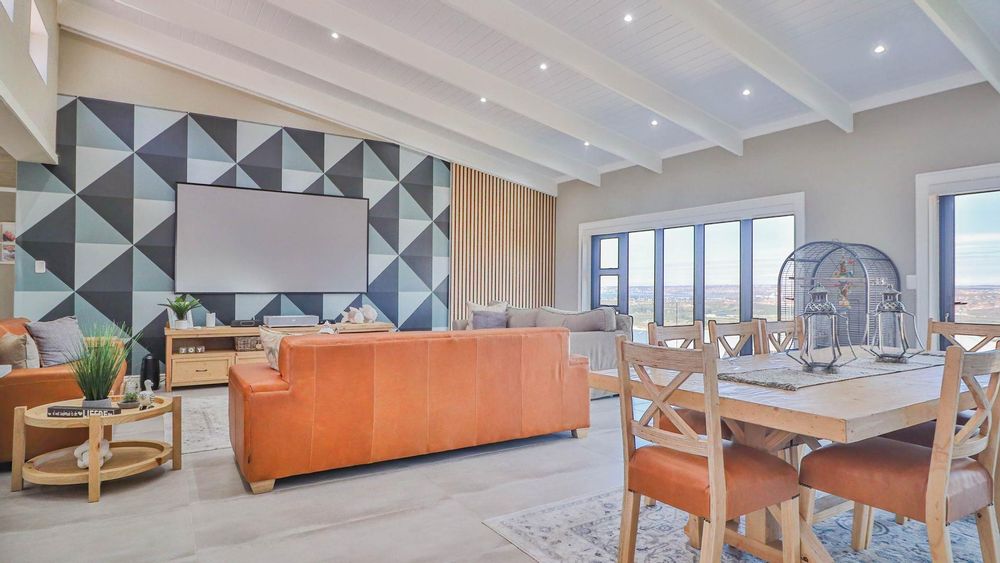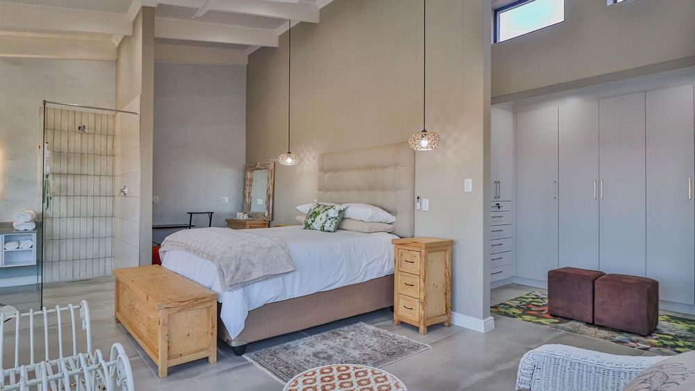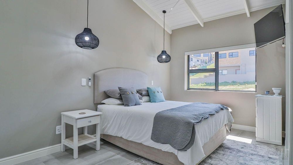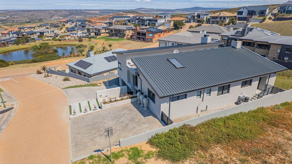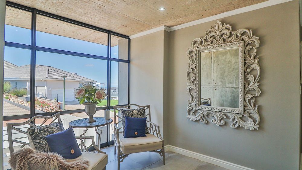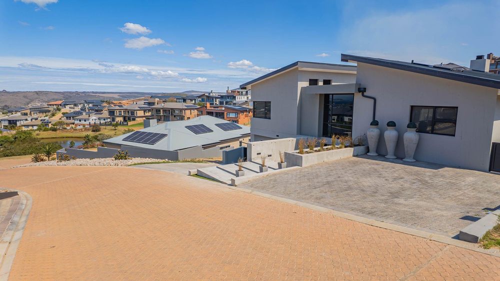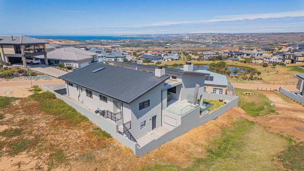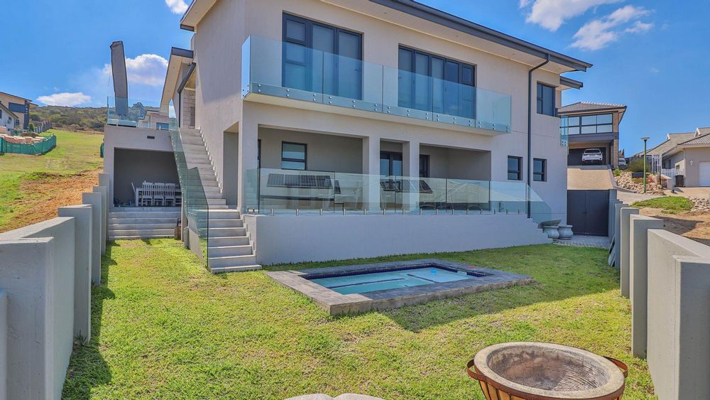 The heart of the home is the open-plan living area, complete with a built-in braai that seamlessly flows into the modern designer kitchen. Here, you'll find exquisite finishes and Caesarstone countertops, along with a separate scullery and pantry for added convenience. The living area opens up with scatter doors to the open stoep area with an exterior built-in braai, providing easy access to the pool area. The living room offers breathtaking sea views, enhancing the indoor-outdoor living experience. The dining room is elegantly integrated into this space, perfect for entertaining guests or enjoying family meals.