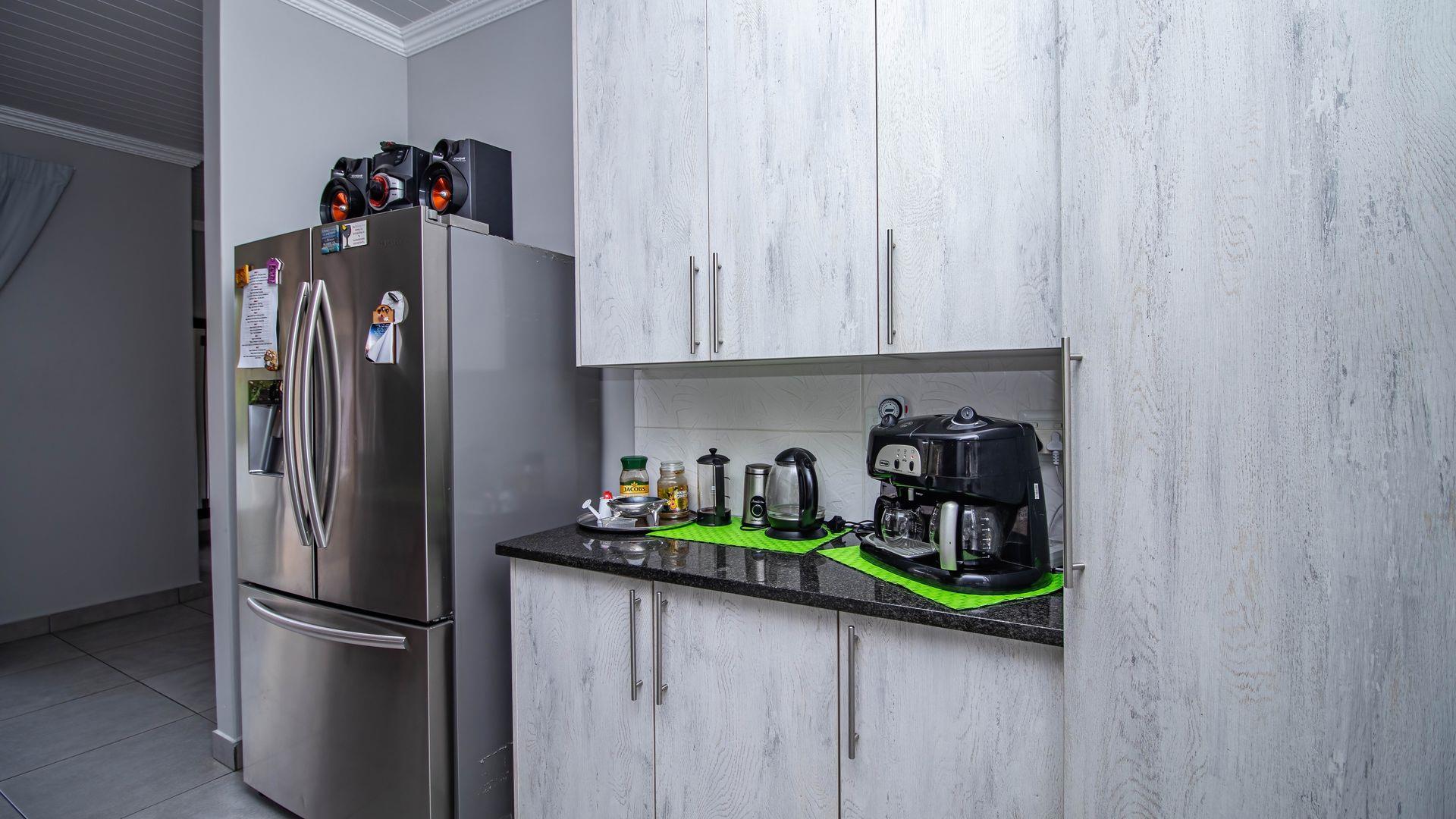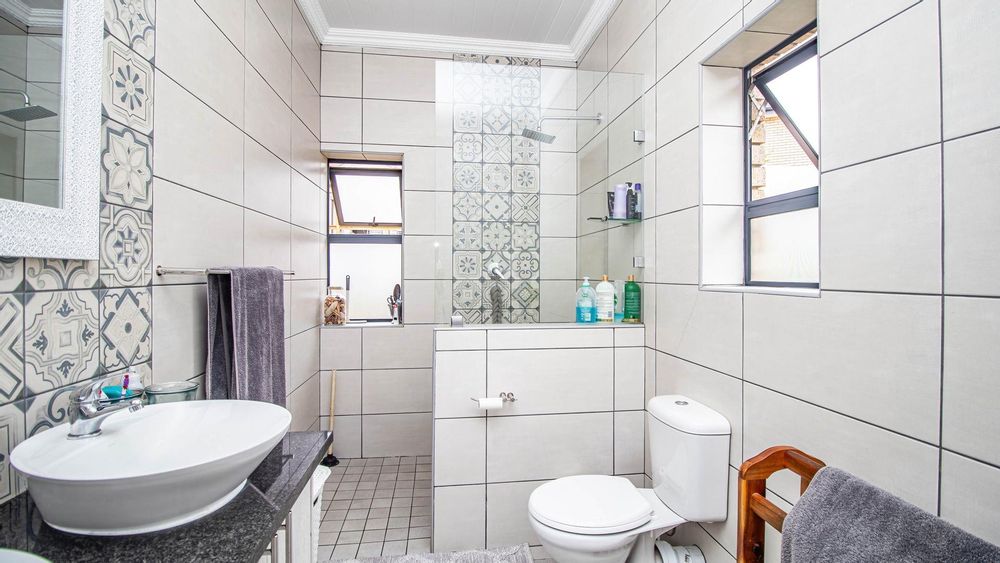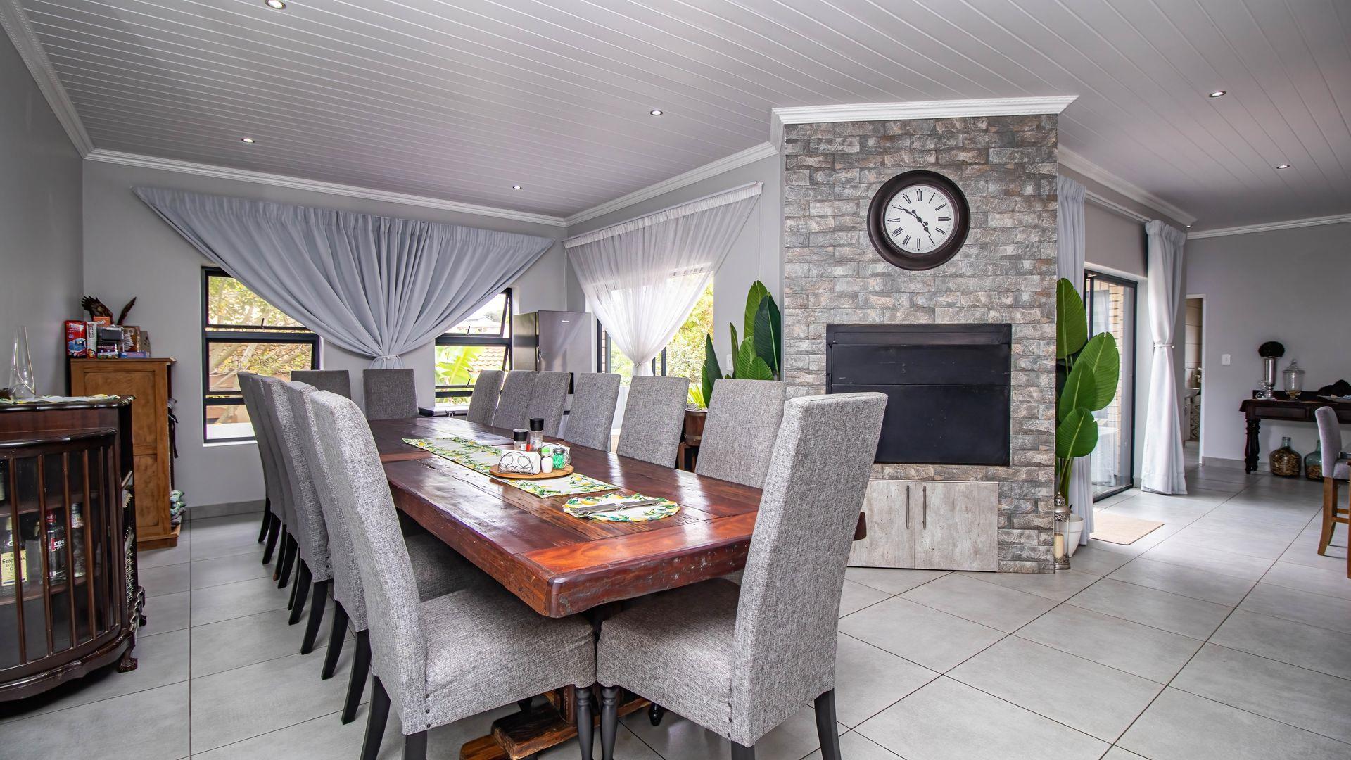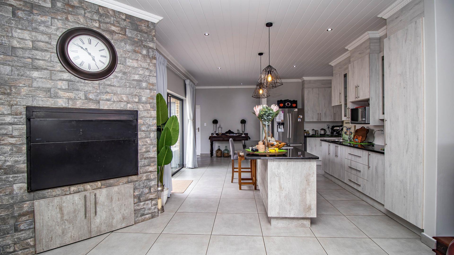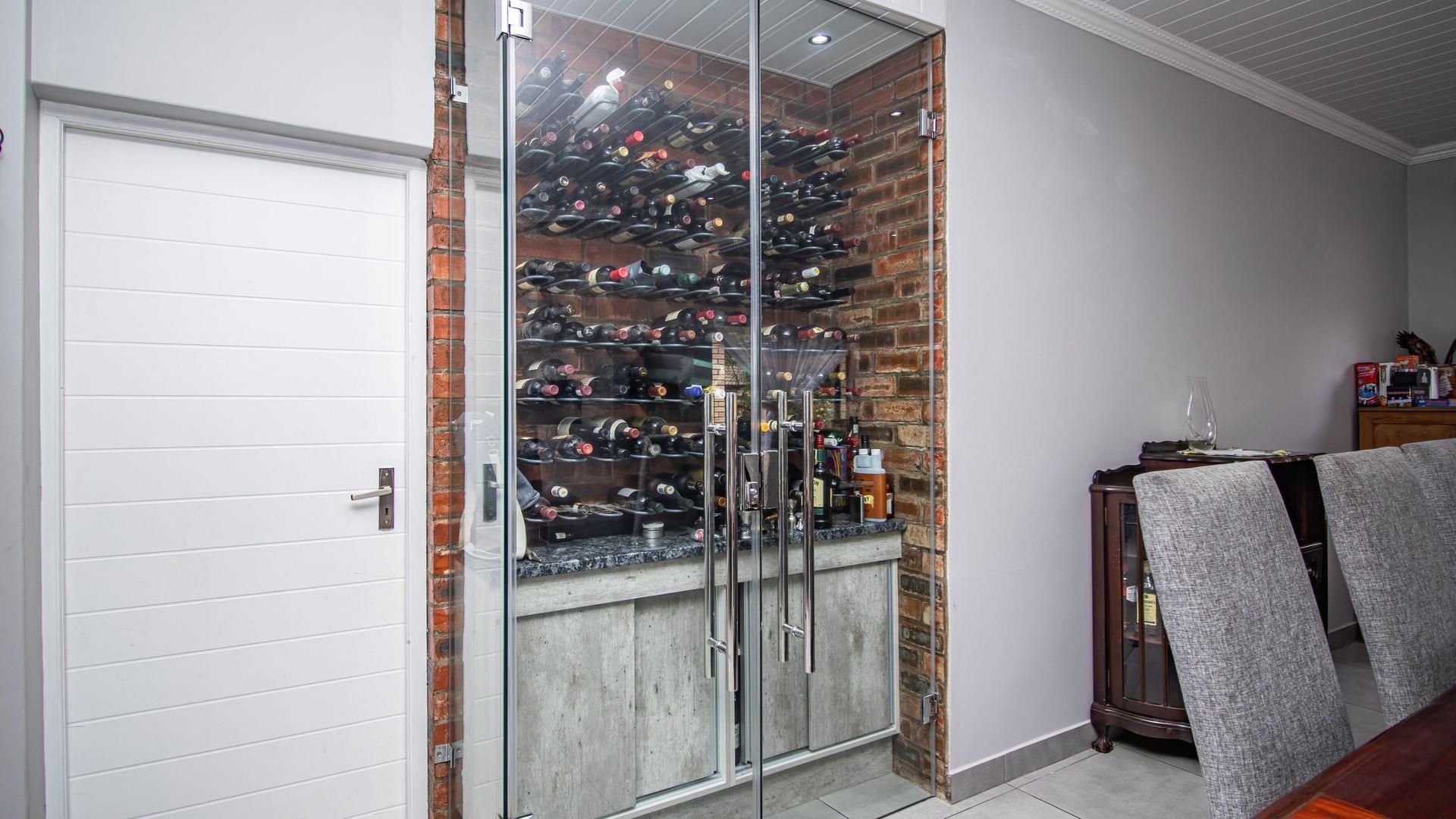 Step inside this "neat as a pin" residence and be greeted by an inviting open-plan living space that seamlessly connects the large dining area and indoor braai (barbecue) area. This layout is perfect for entertaining guests or enjoying cozy family gatherings. For wine enthusiasts, a small glass-enclosed wine storage adds a touch of sophistication to your hosting capabilities.