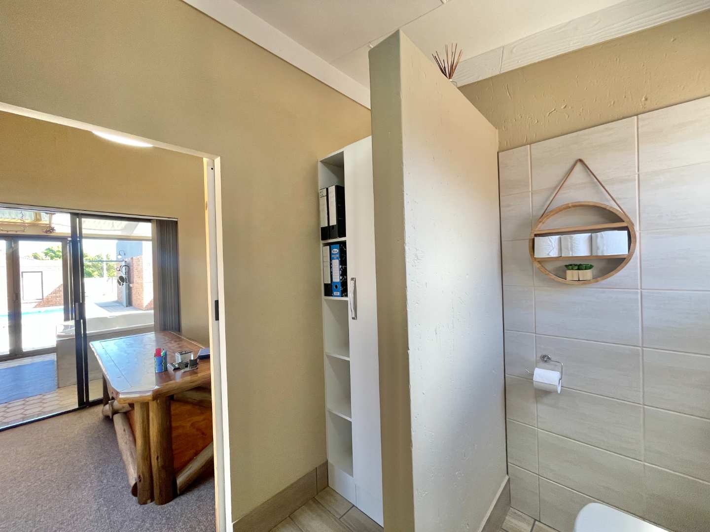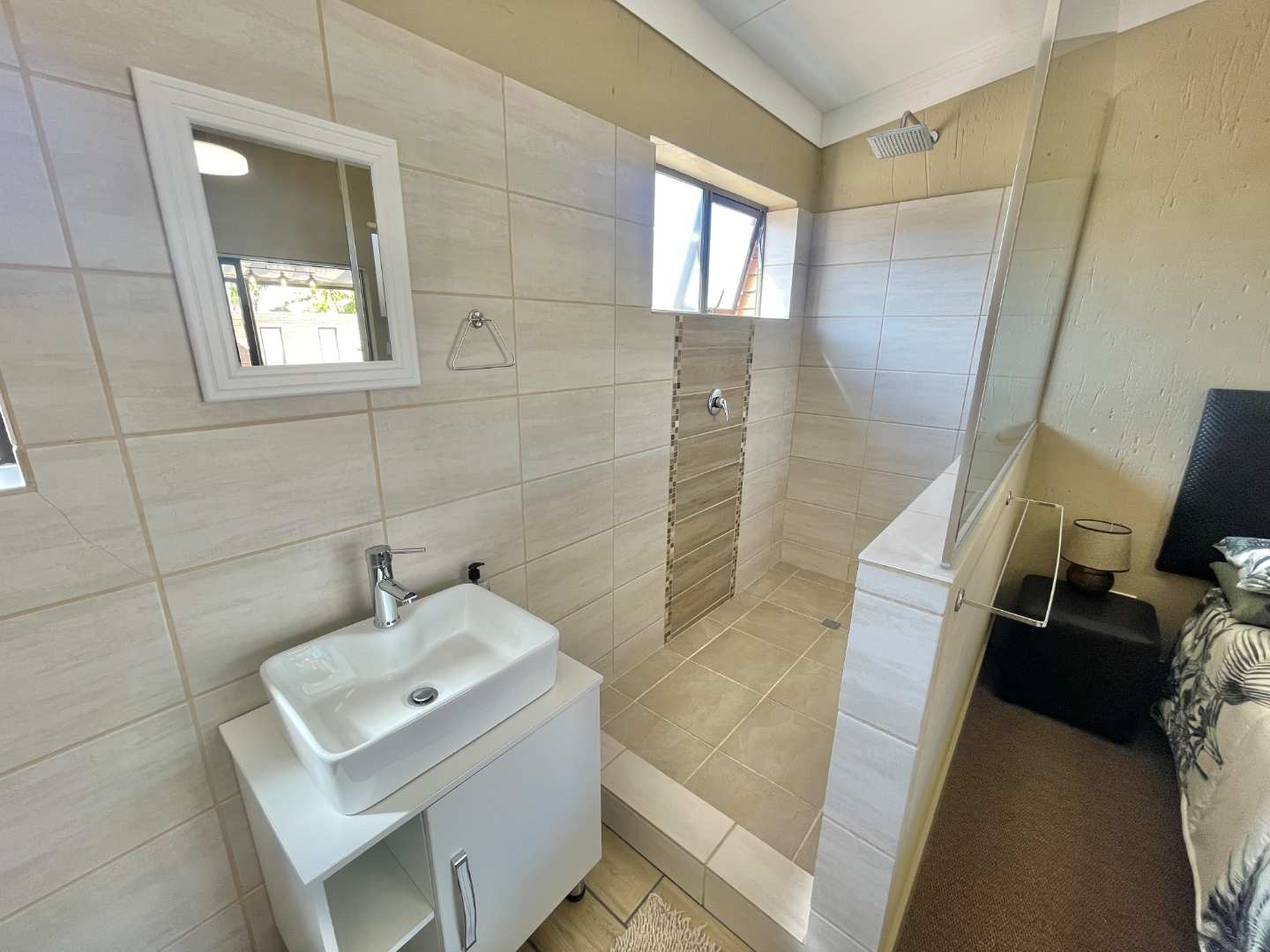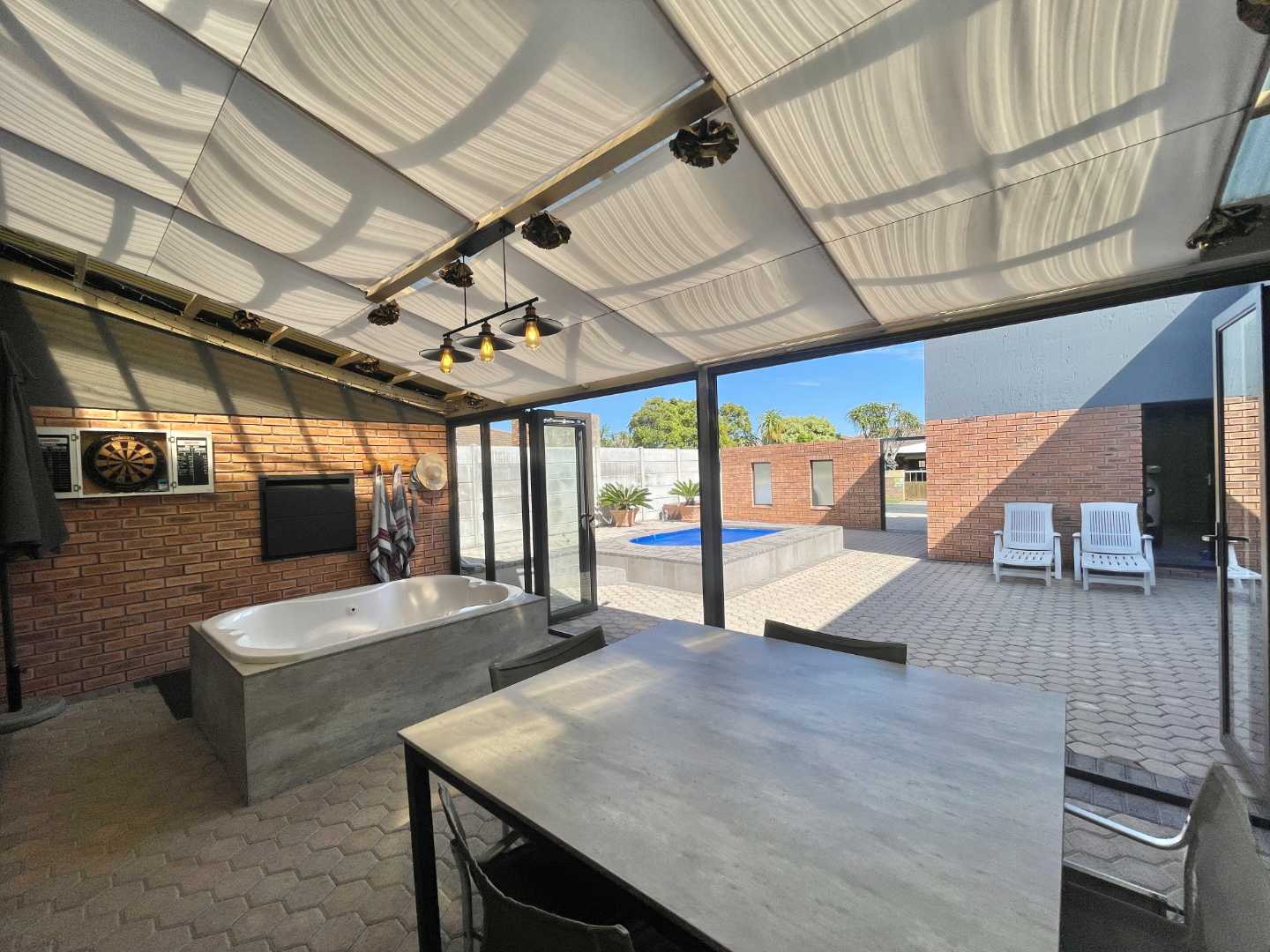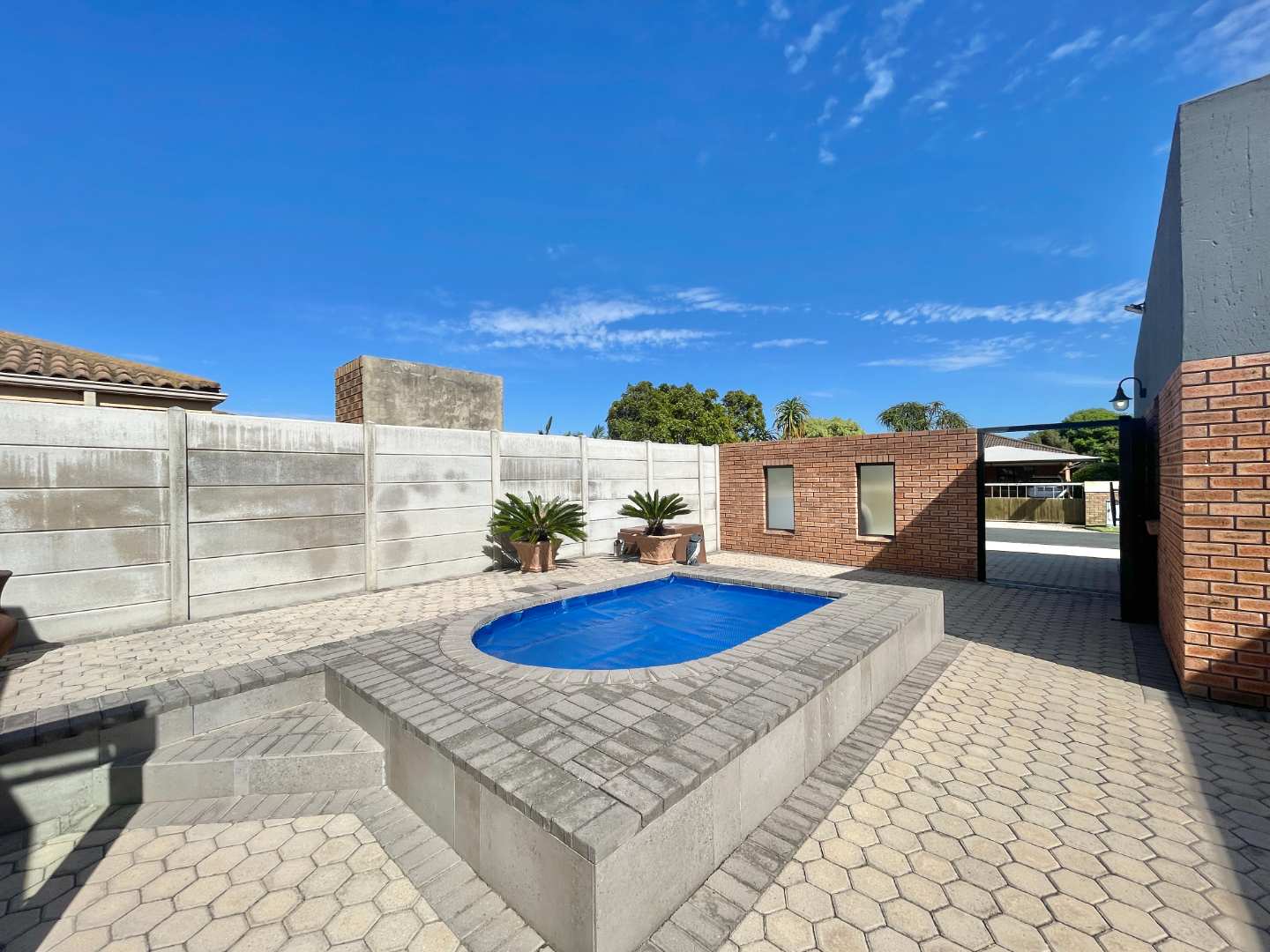 The home offers three generous bedrooms, each with its own private en-suite bathroom, as well as a flexible fourth room that can easily serve as a guest bedroom, home office, or study. An inviting enclosed braai and stoep area creates the ideal setting for entertaining, featuring a relaxing hot tub and seamless access to a private splash pool—perfect for unwinding after a day at the coast.