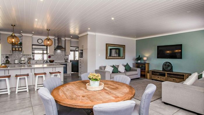 Relaxed riverside holiday living near Hartenbos beach, with mountain and river views, open-plan living and a dedicated braai area — three bedrooms, two bathrooms and single garage.