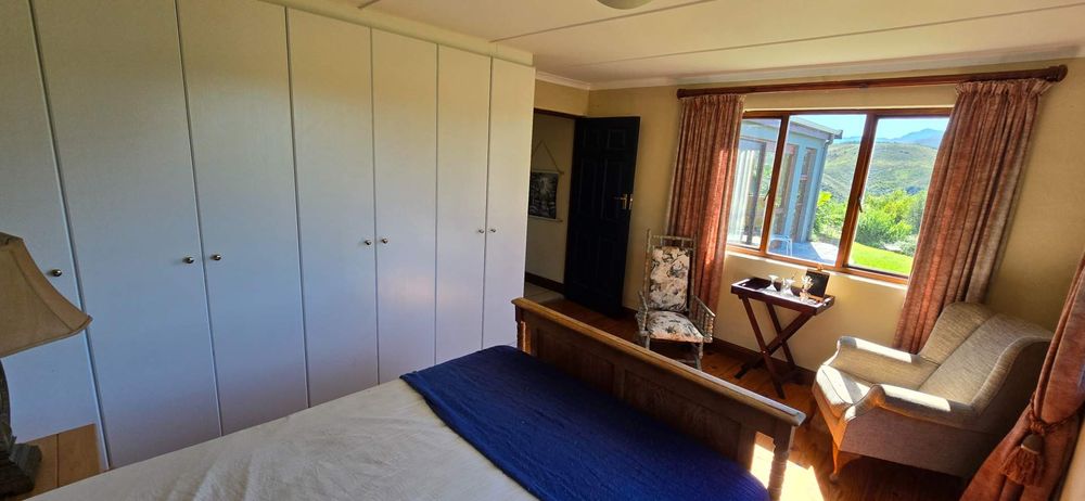 Additionally, there is a charming cottage offering two bedrooms and a 180-degree view over the Leeuwekloof valley, perfect for guests or as a holiday rental. A second older 3 bedroom farmhouse, located 400m from the main house at a lower elevation, features an original fireplace and its own solar system.