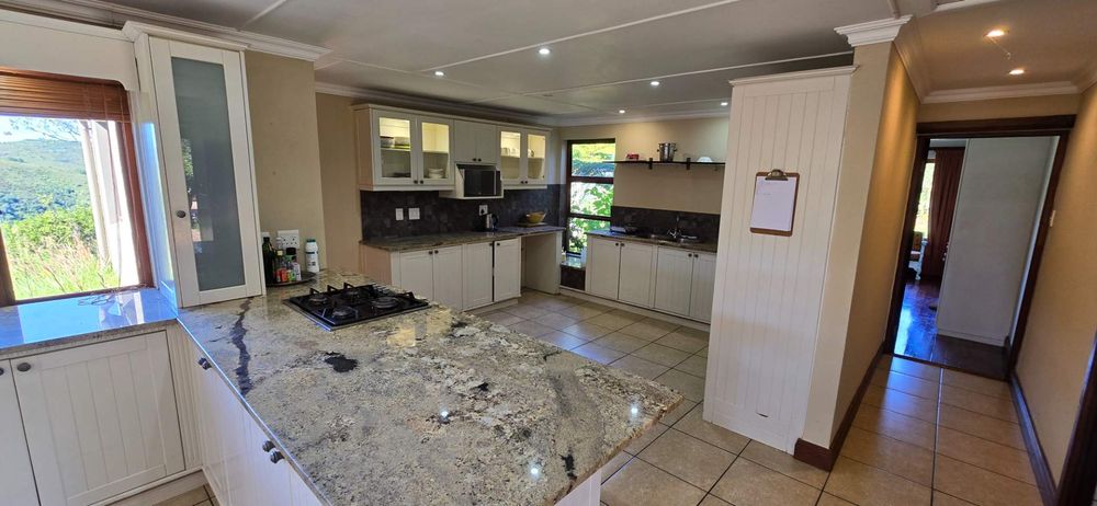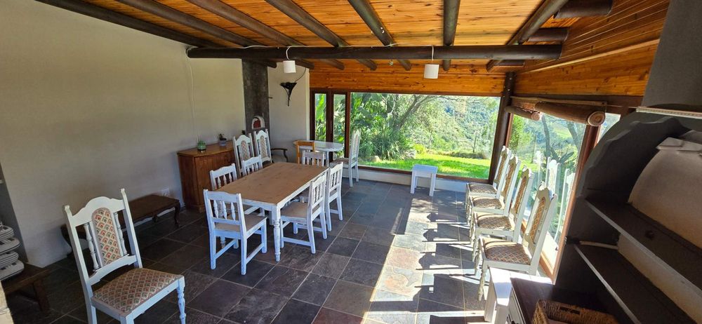 The main house is strategically positioned for panoramic views in all directions, complemented by a spacious deck and inviting swimming pool. The property includes a braai room with Mountain and valley views over the deck and pool, an entertainment room with a pizza oven, ample glass elements allowing for natural light, and spacious bedrooms for comfort. An open plan kitchen and living area and 2 beautiful fireplaces ensures a cosy and homely feel.