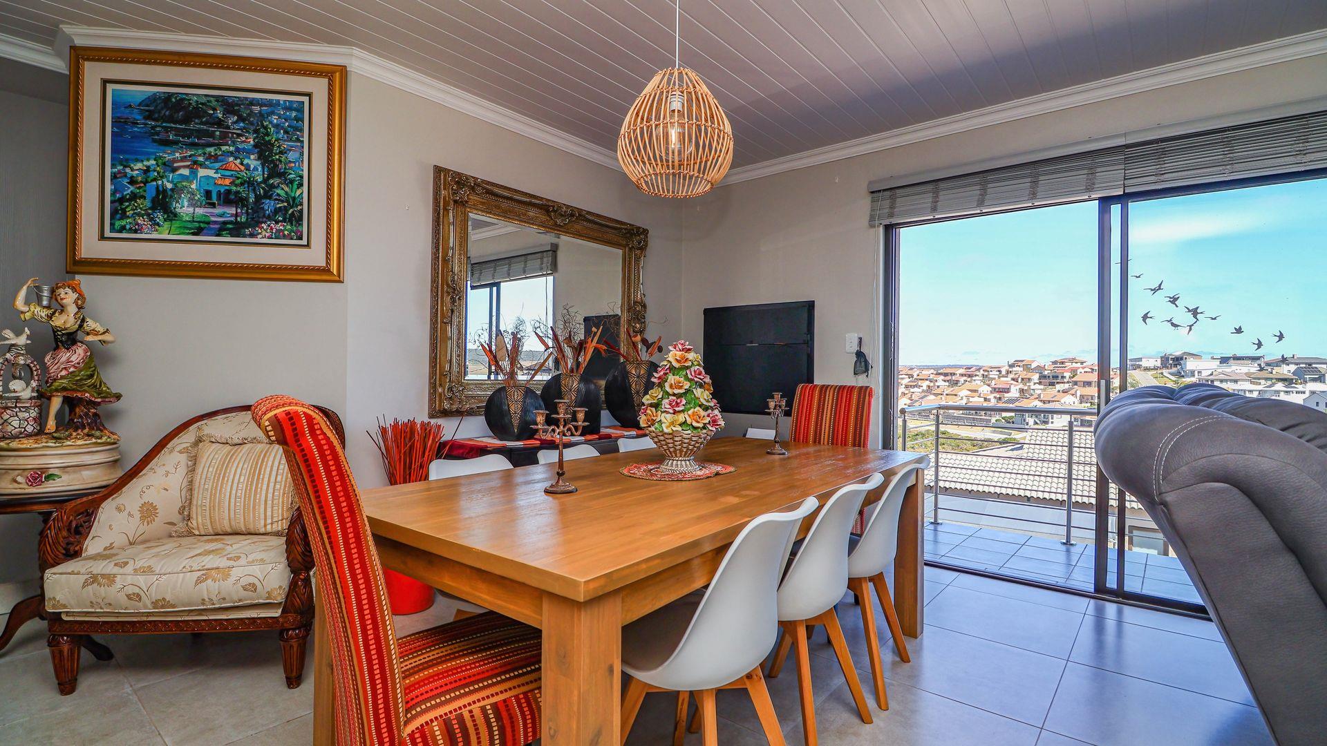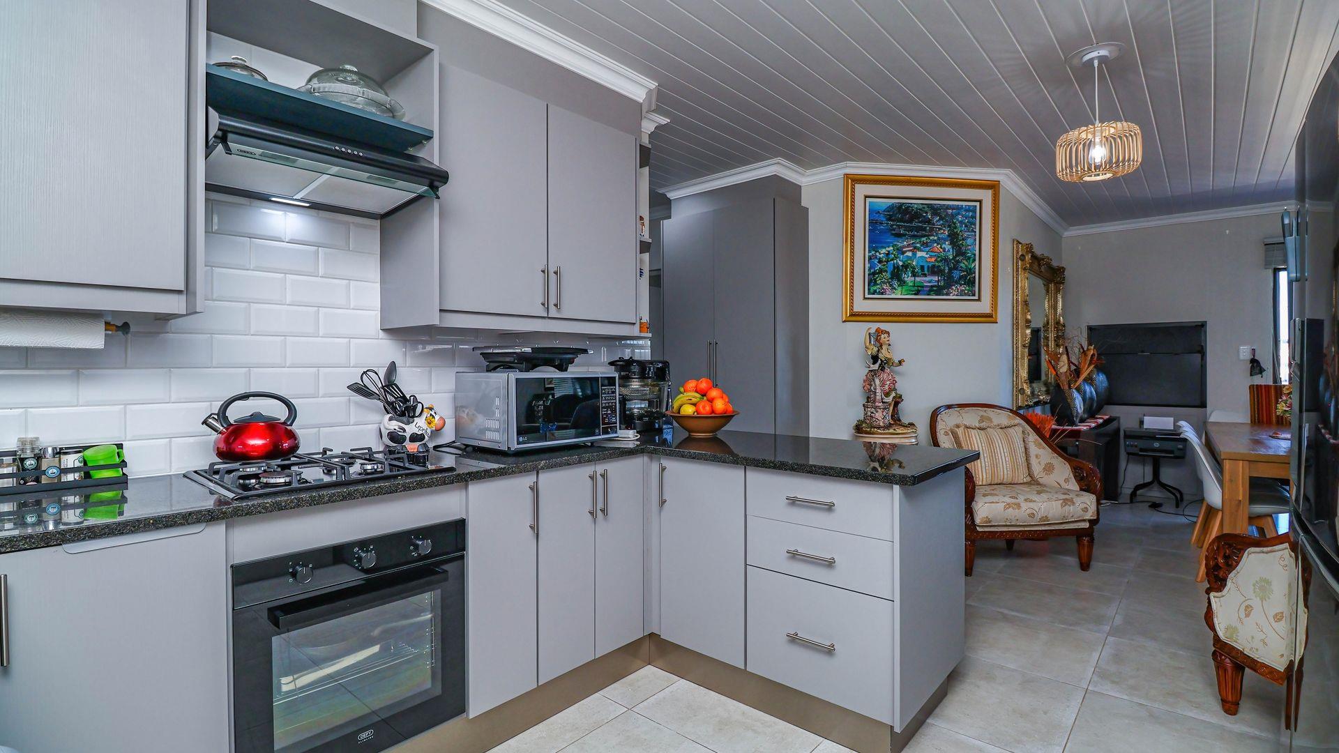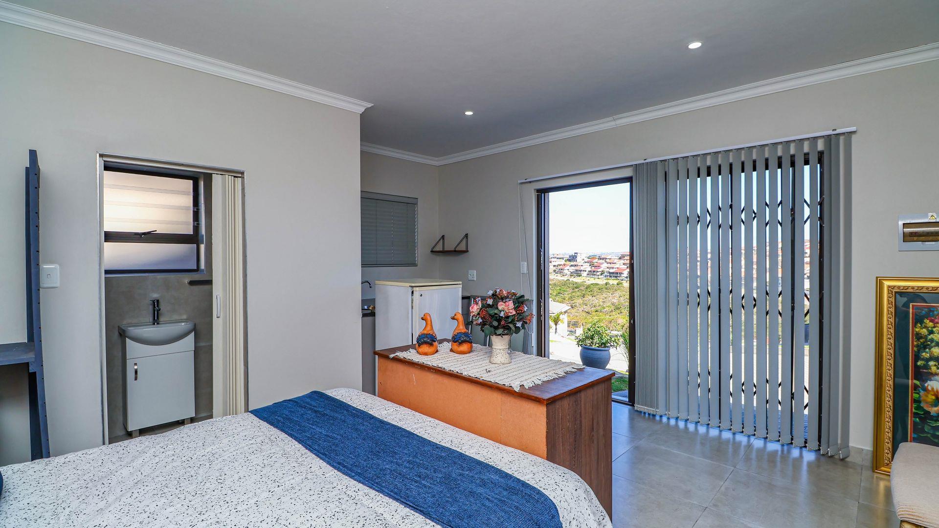 Upon entry, you are greeted by an open plan living area that seamlessly flows into a modern, functional kitchen. The kitchen is a culinary delight, featuring a gas stove, electric oven, and luxurious marble countertops. Adjacent to the living area is an entertainment room designed for ultimate leisure, equipped with a built-in braai. The braai area extends through a sliding door onto a balcony area, offering stunning sea views that provide the perfect backdrop for relaxation or entertaining guests.