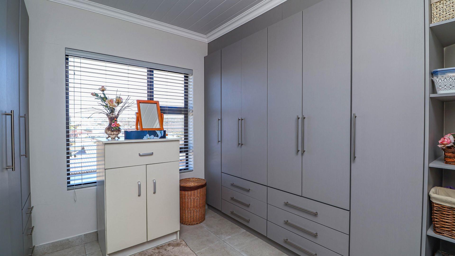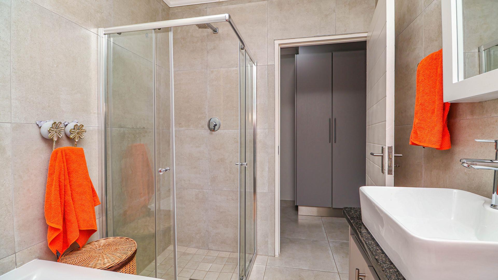 This townhouse accommodates three generously sized bedrooms, each with quality built-in cupboards, blinds, and elegant tiled floors. The main bedroom is a private retreat with an en-suite bathroom, complete with a shower, basin, and toilet. The two guest rooms share a well-appointed family bathroom featuring a shower, bath, basin, and toilet.